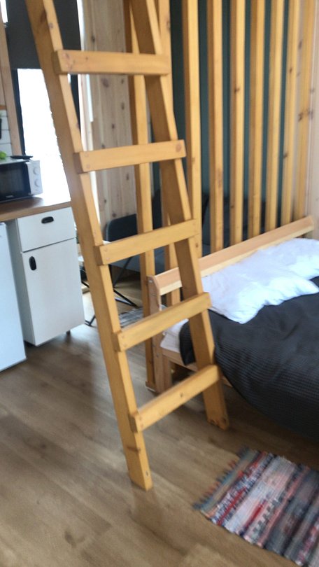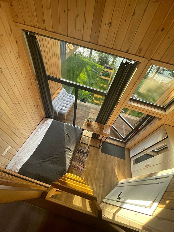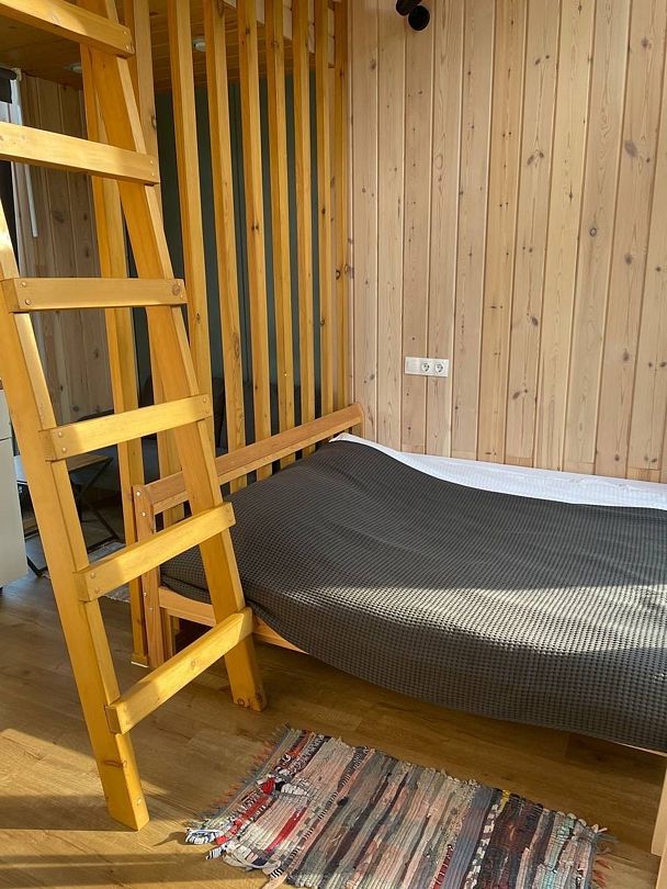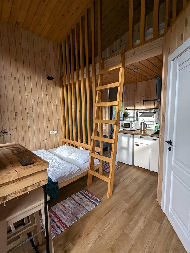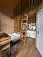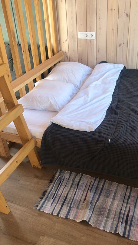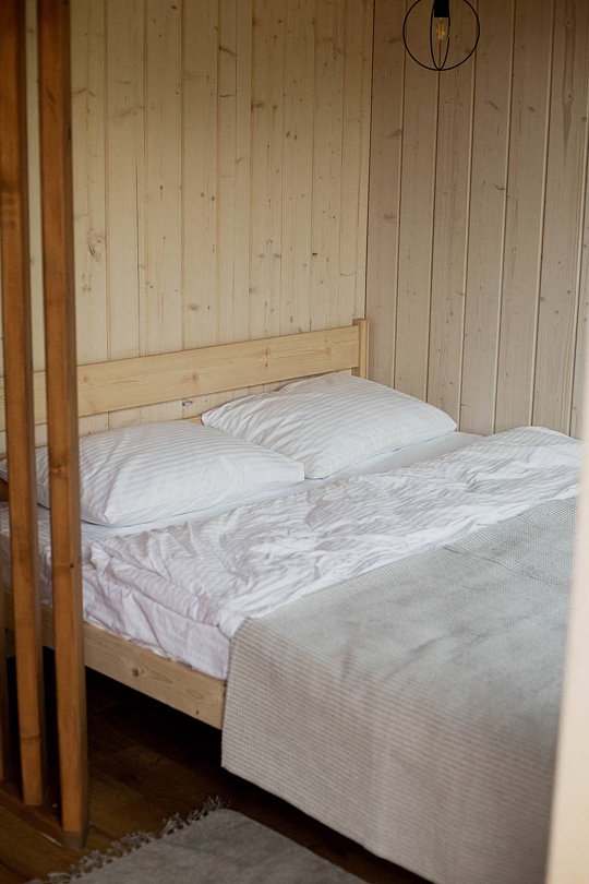 Домик идёт на 4-х человек с двумя большими двуспальными кроватями (одна с видом на горы, другая на Катунь), но дополнительно есть два спальных места.