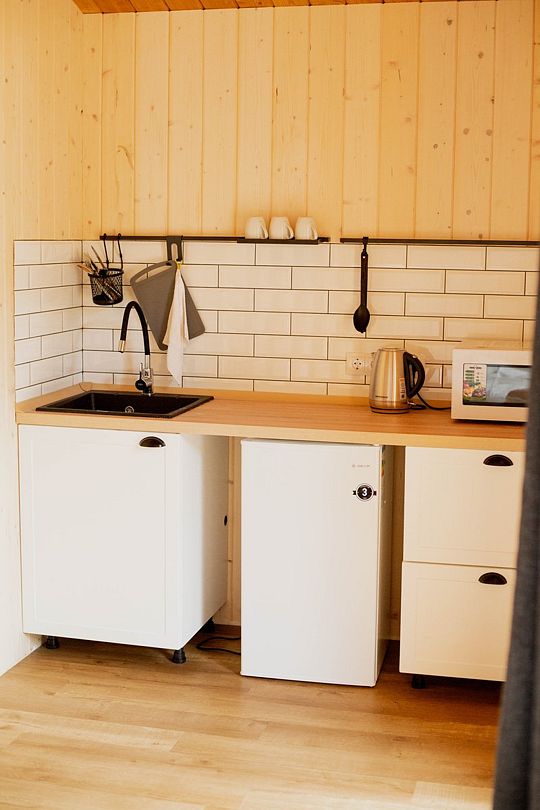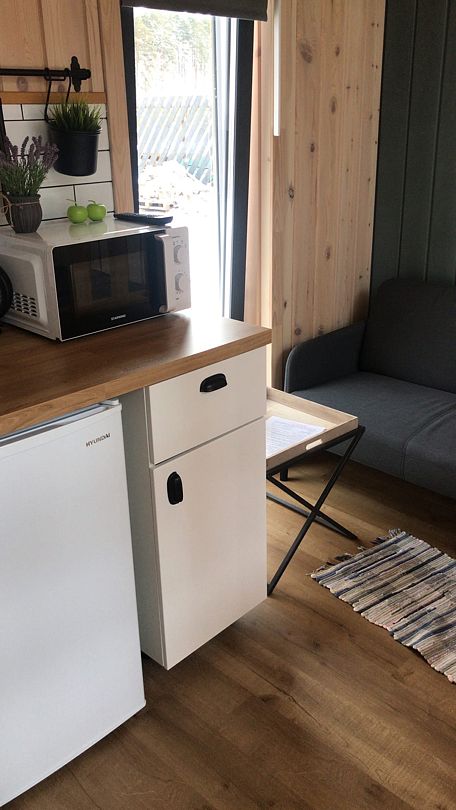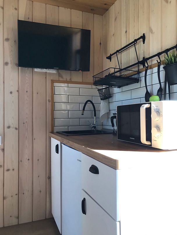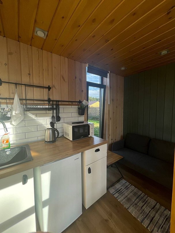 Кухонная мини-зона: холодильник, эл/чайник, микроволновая печь, все столовые принадлежности (нож, штопор, столовые приборы, консервный нож, разделочная доска), посуда (тарелки плоские большие и средние, глубокие средние, стаканы для воды, чайные чашки), средство для мытья посуды, мешки для мусора.
