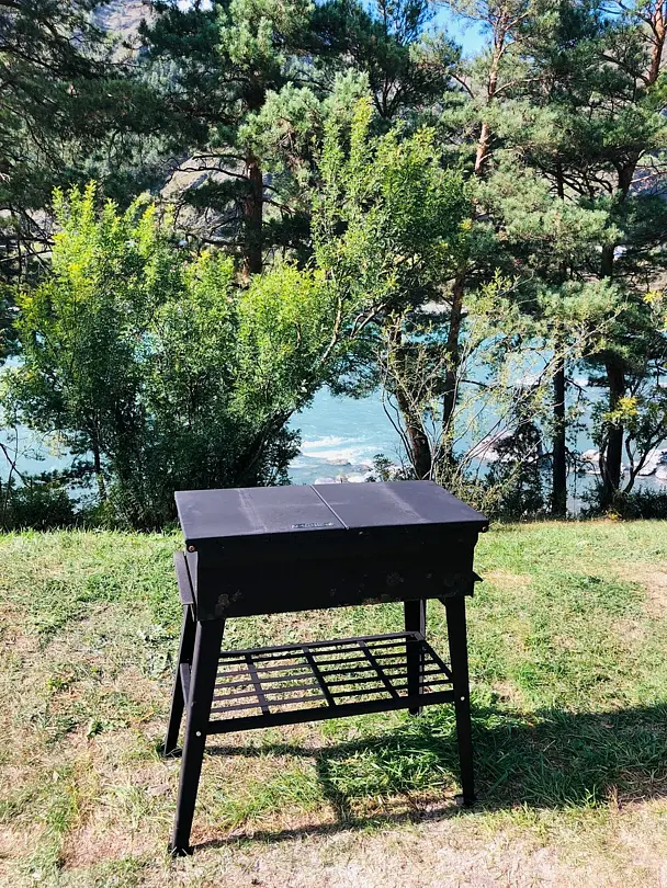 На территории есть садовая мебель и мангальная зона: мангал, печь под казан.