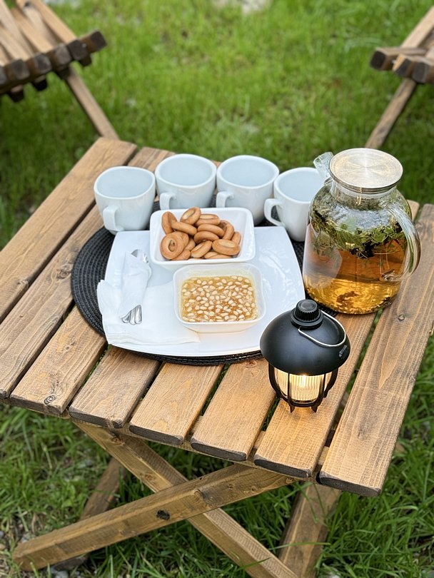 Чайная церемония с травяным чаем, медом с орешками и сушками (комплиментарно).