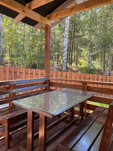 На просторной террасе есть стол и две скамейки. Также есть зона для барбекю с мангалом, решёткой и шампурами. Уголь и жидкость для розжига нужно покупать самостоятельно.