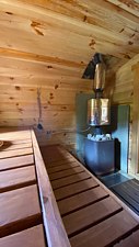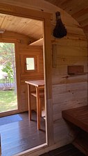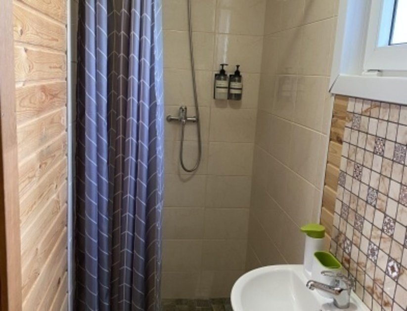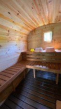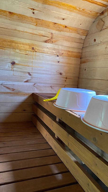 Гости могут самостоятельно растопить сауну. Шапки и простыни предоставляются. Рядом с сауной стоит обливочное ведро с холодной водой. Санузел совмещенный: душевая, унитаз, раковина, бойлер, стиральная машина, фен для волос, средства гигиены.