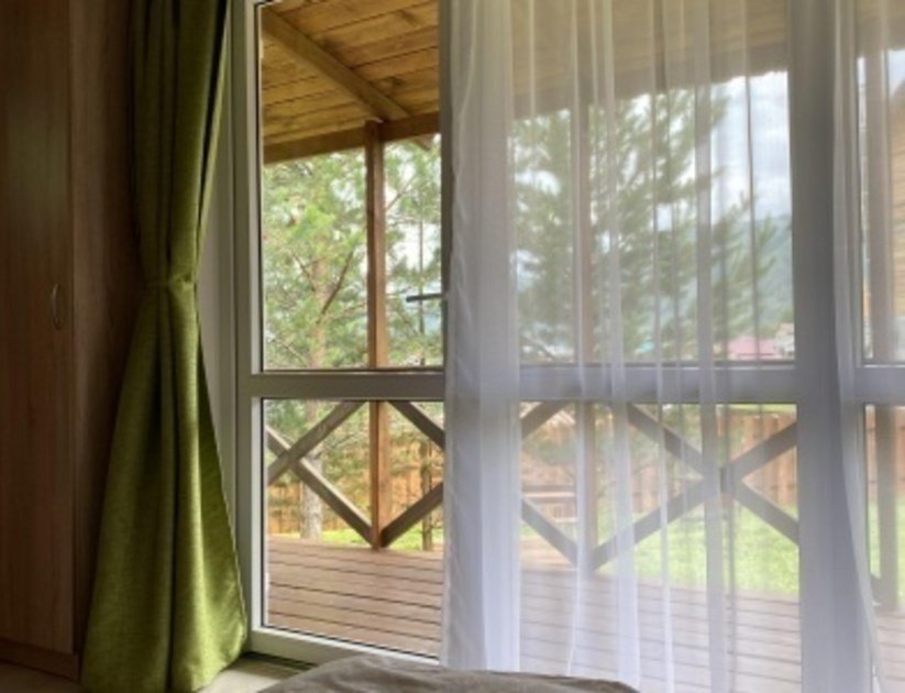 Максимальная вместимость домика — четыре человека. Площадь домика — двадцать квадратных метров. Домик полностью утеплен и благоустроен. На каждого гостя предусмотрен комплект полотенец. Шампунь и гель для душа, ватные палочки, ватные диски, туалетная бумага, фен для сушки волос.