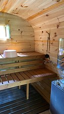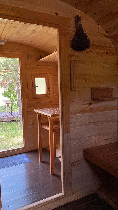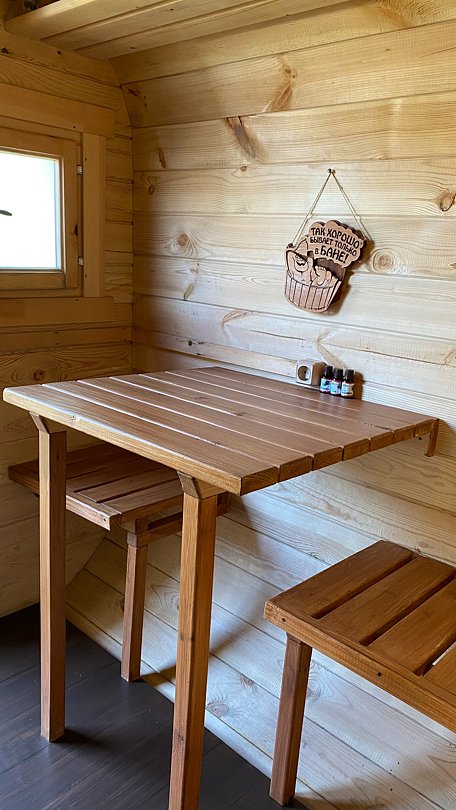 В варианте проживания «Большой дом с сауной» есть собственная парная, которую можно растопить самостоятельно. Для этого в комплекте предусмотрена одна охапка дров, а время прогрева составляет около 45 минут.