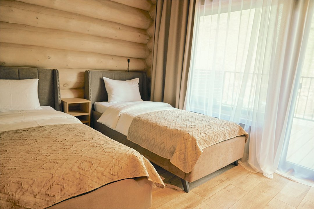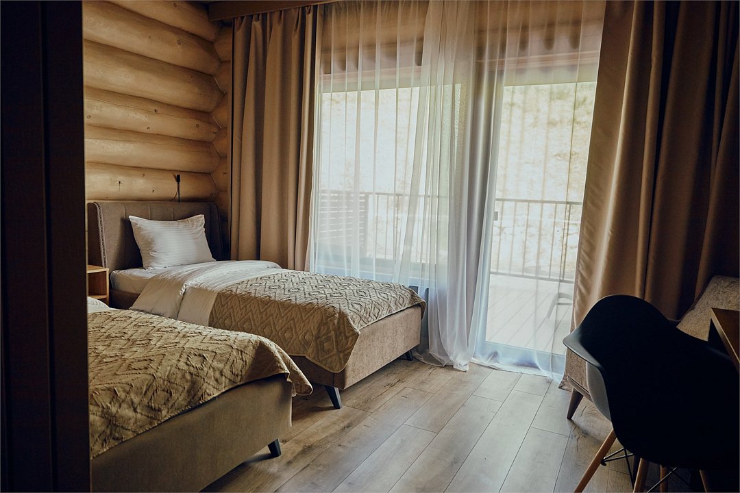 Wi-Fi, фен, теплый пол, халаты, банные полотенца, тапочки, балкон с красивым видом, две полутораспальные кровати, шкаф для одежды, зеркало, чайник, душ, кресло, стул, стол, туалетные средства, мини-холодильник, без питомцевВ номере
