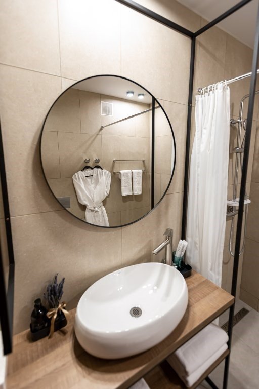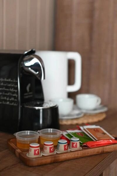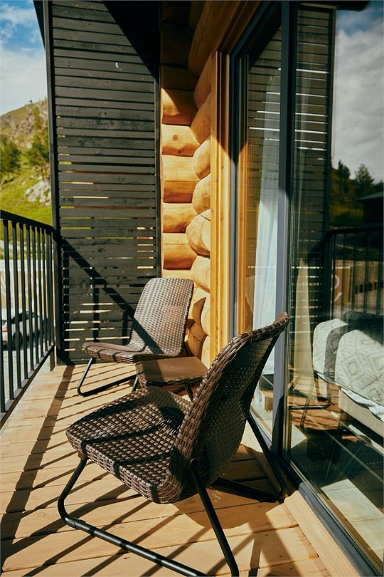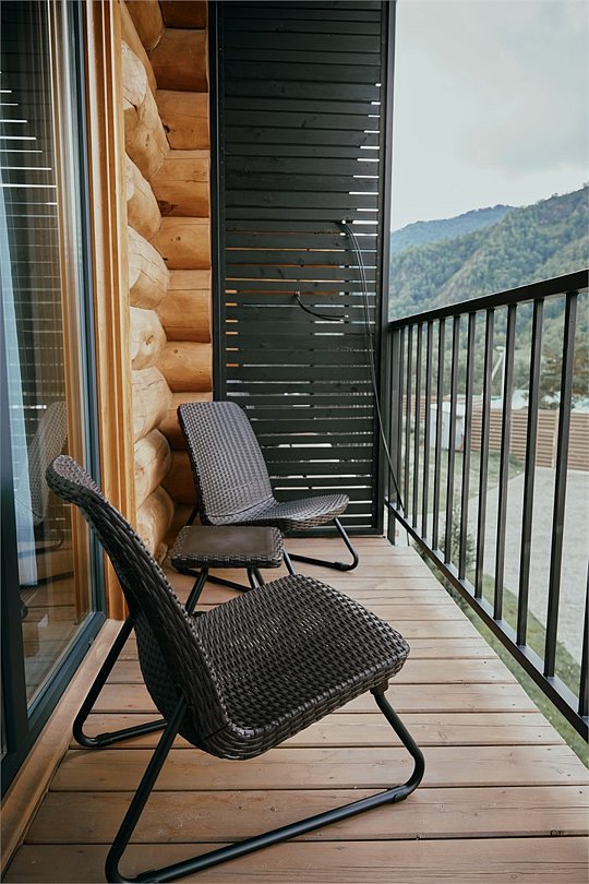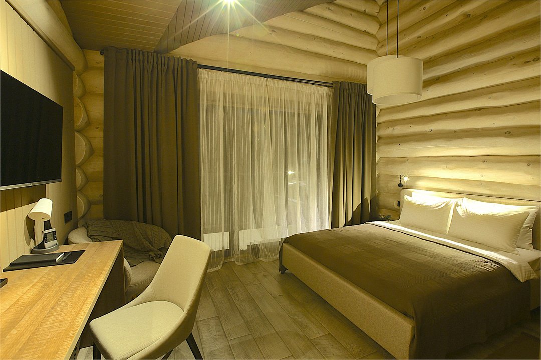 Wi-Fi, фен, кофемашина, теплый пол, халаты, банные полотенца, тапочки, косметические средства, балкон, двуспальная кровать, тумбы, шкаф для одежды, зеркало, чайник, кресло, стул, стол, туалетные средства, мини-холодильник, вид на горы, телевизор со Smart TV, вода из артезианской скважины, без питомцевВ номере