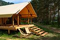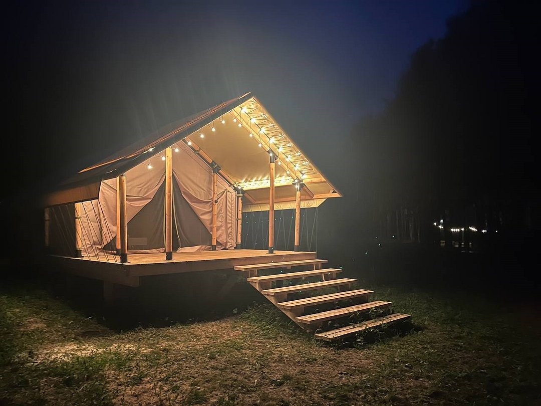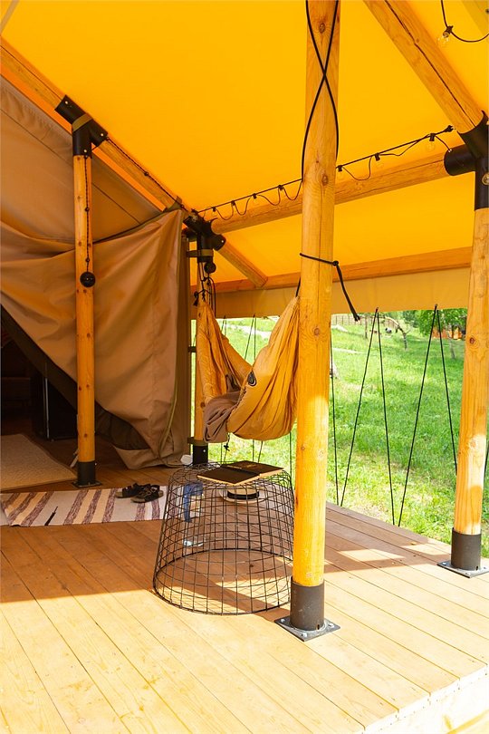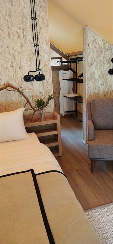 - В номерах деревянного дома размещение с животными запрещено. С мая по октябрь открыт глэмпинг у реки и взять своего любимца с собой вы сможете при размещении в благоустроенных сафари-тентах.