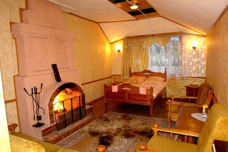 Комфортабельный: камин, двуспальная кровать, 2 тумбочки, диван, 2 кресла, столик, телевизор, зеркало, шкура медведя