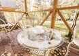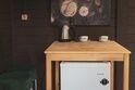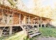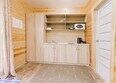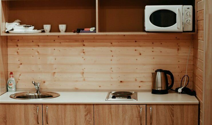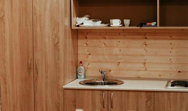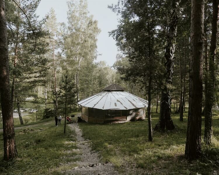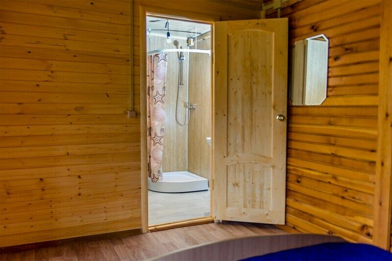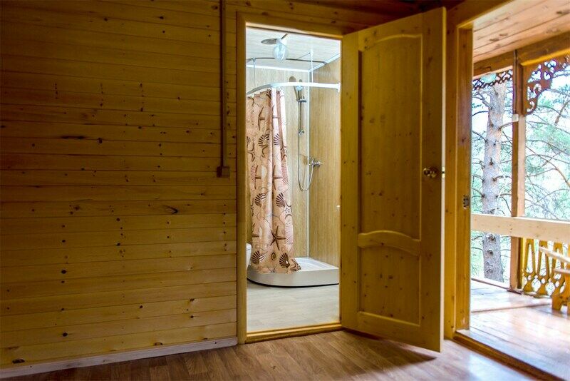 Инфраструктура: зона отдыха, шапочки, душ, березовые веникиУютная летняя баня выполнена в виде продолговатой деревянной бочки. Возможно, с виду она и не выглядит внушительно, однако, в ней умещается парная, мойка и уютная комната отдыха с панорамным окном, в которой можно выпить травяной чай с натуральным алтайским мёдом, глядя на таежный лес.