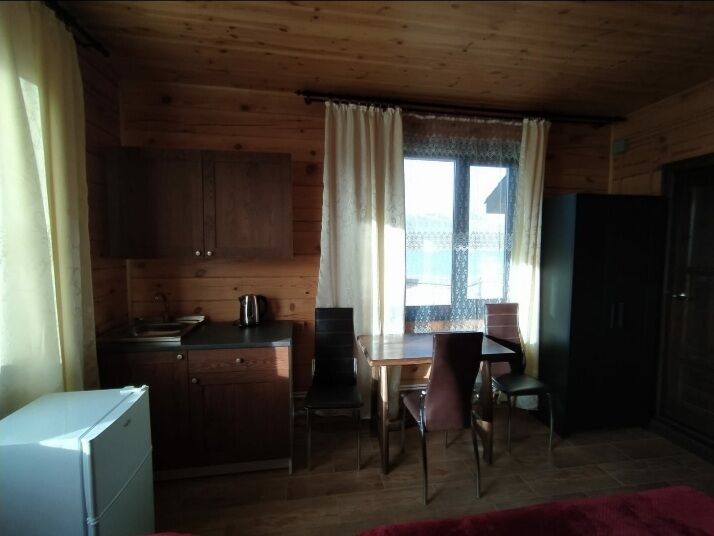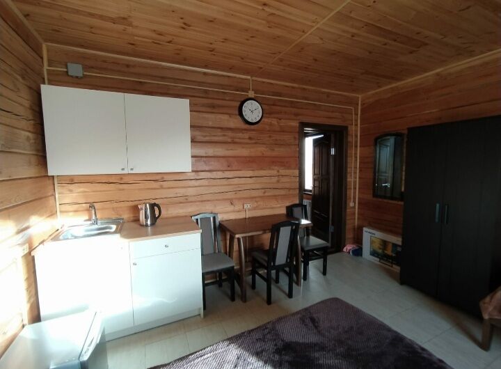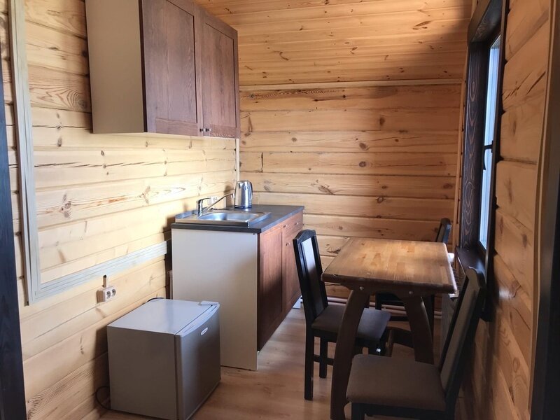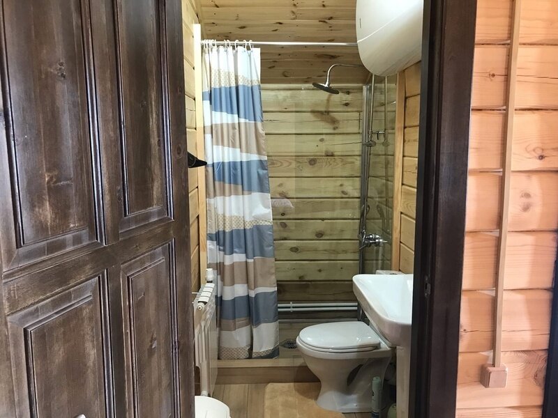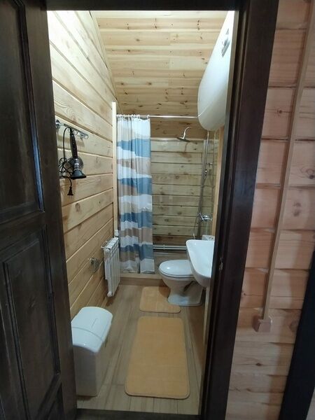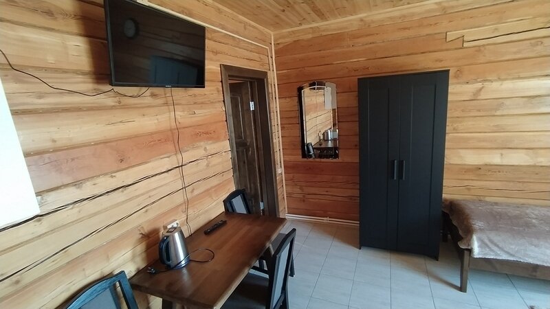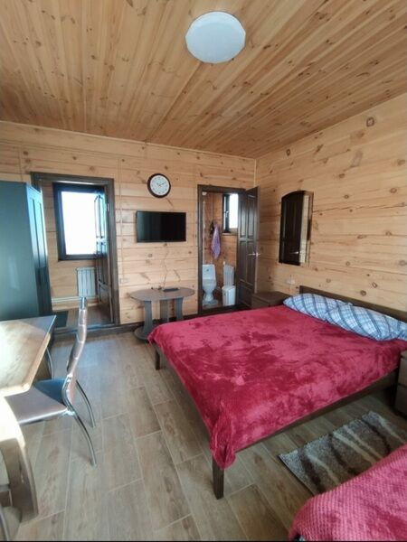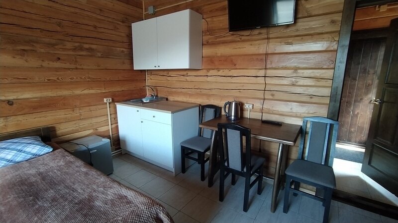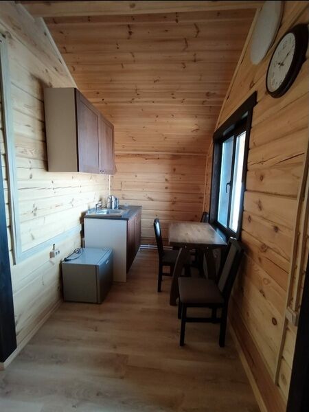 Домик ориентирован на три места. Одна двуспальная и одна односпальная кровати с анатомическими матрасами "Аскона", одеяла и подушки, телевизор со спутниковым телевидением, кухня, санузел с необходимыми принадлежностями.