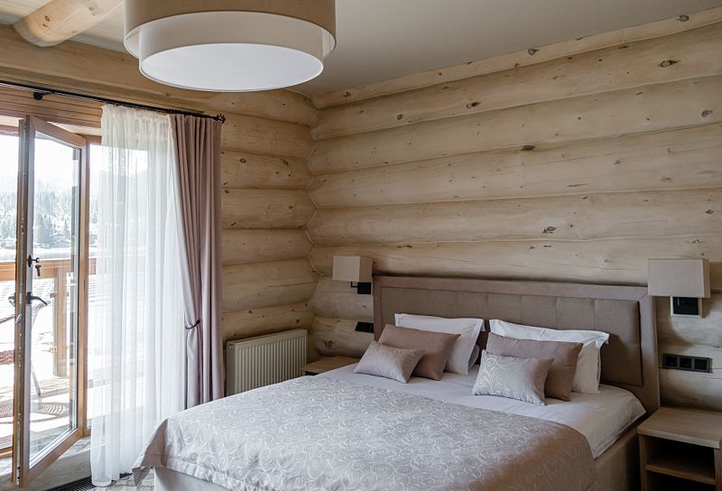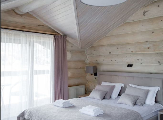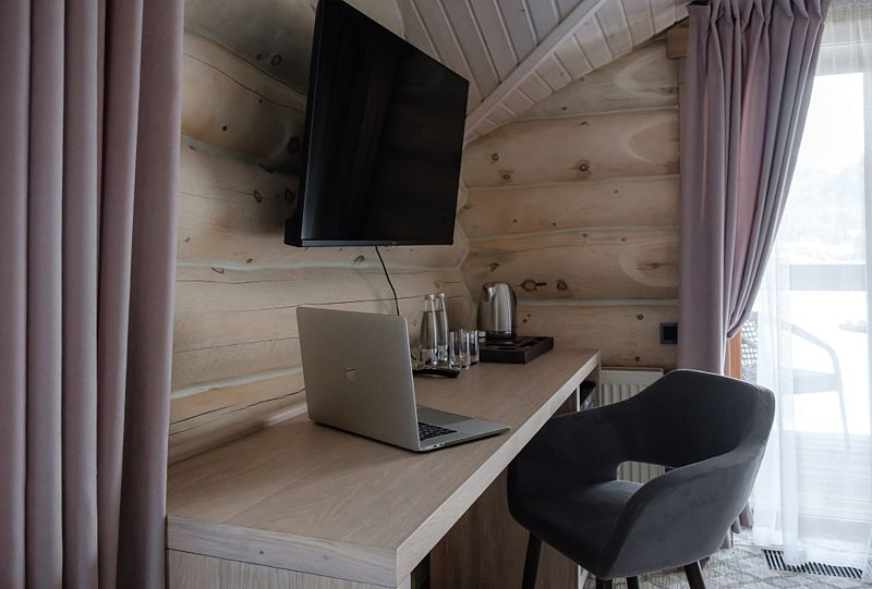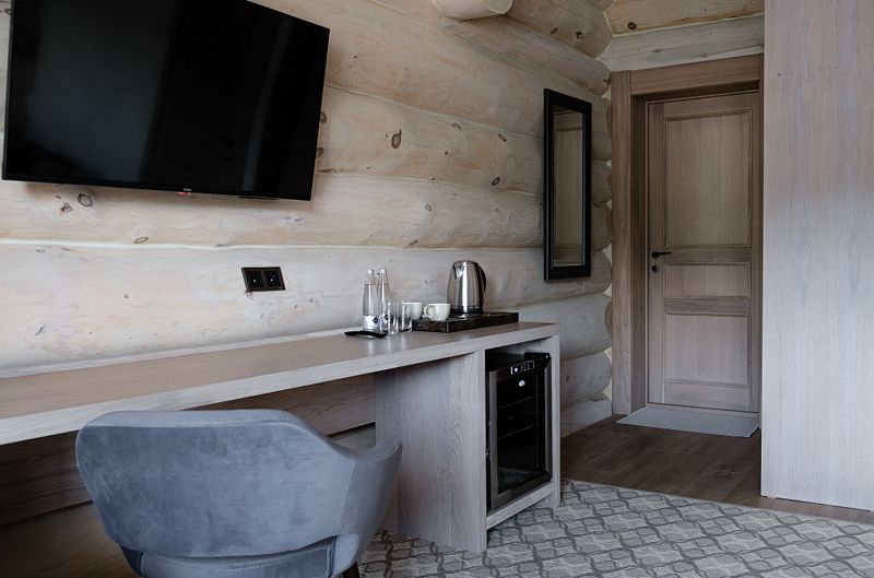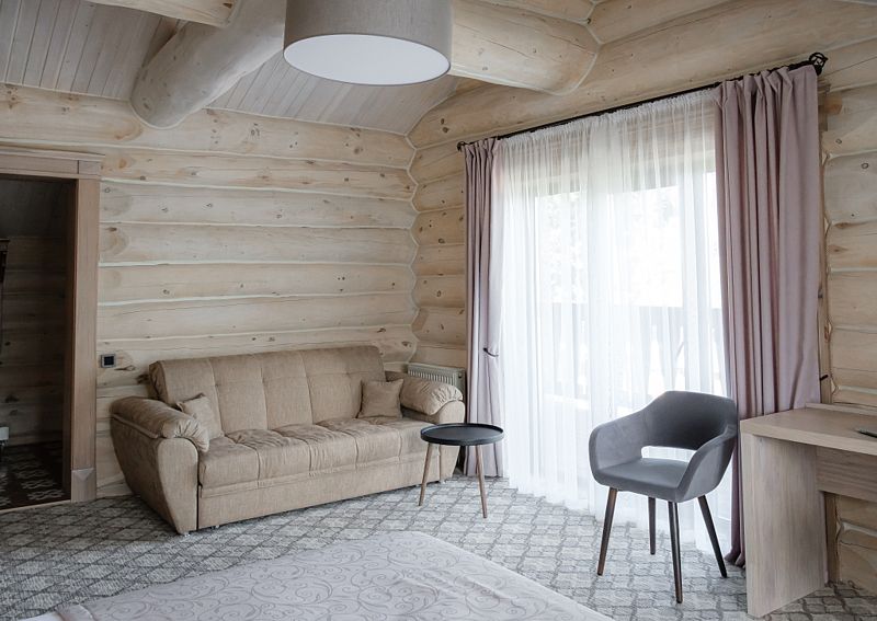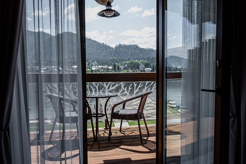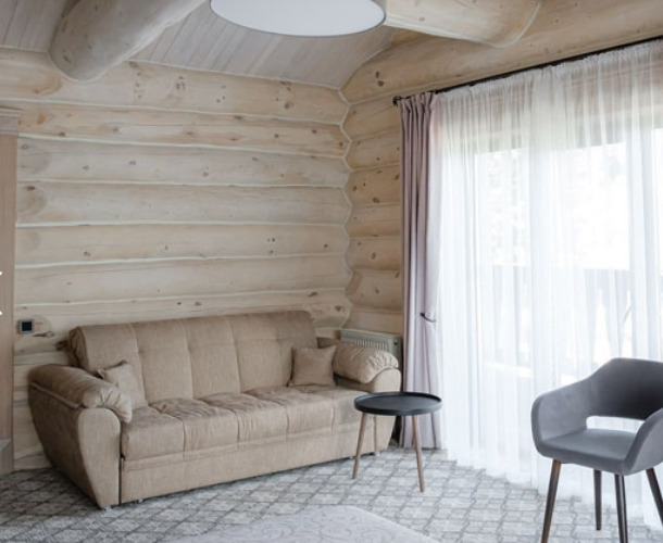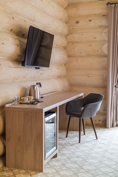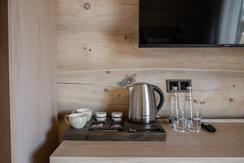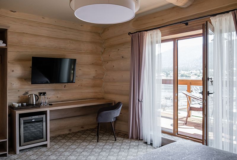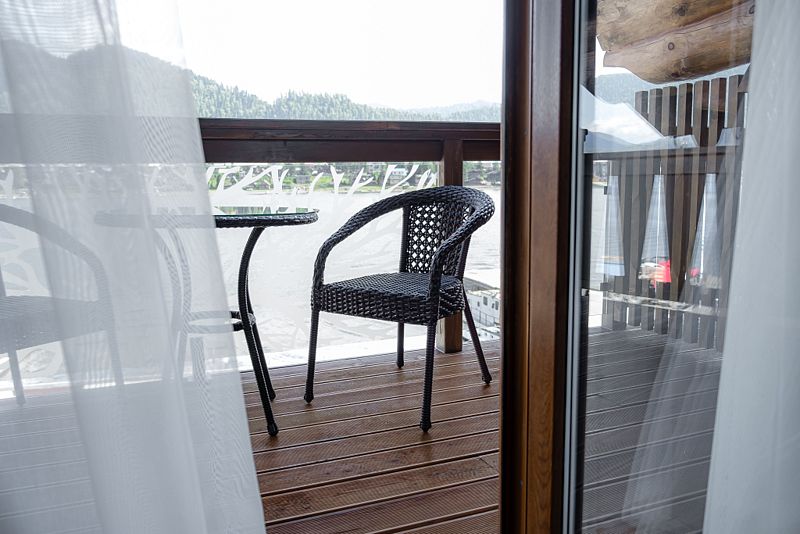 Гостиница представляет собой один 3-этажный корпус, выполненный из кедра. Все номера оборудованы балконами, с которых открывается живописный вид на озеро. Комплектация комнат предусматривает необходимую мягкую и корпусную мебель, ТВ, мини-холодильник, чайную станцию, индивидуальный санузел с душевой кабиной, феном, халатом и туалетными принадлежностями.