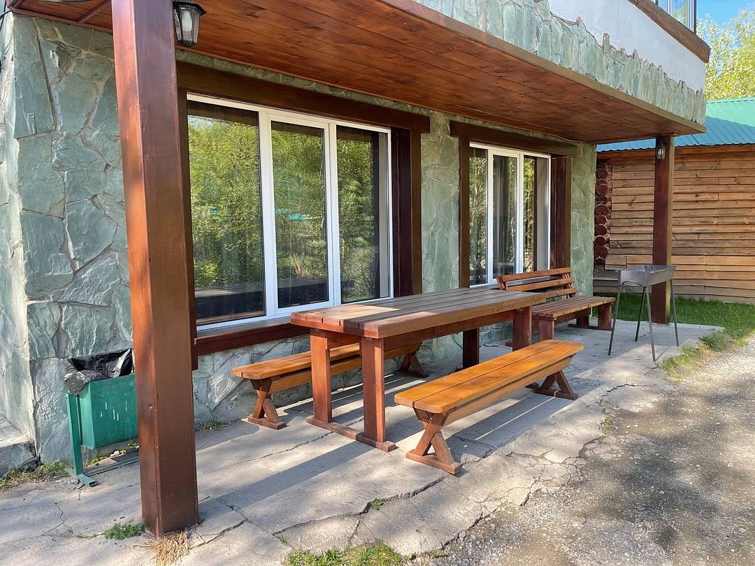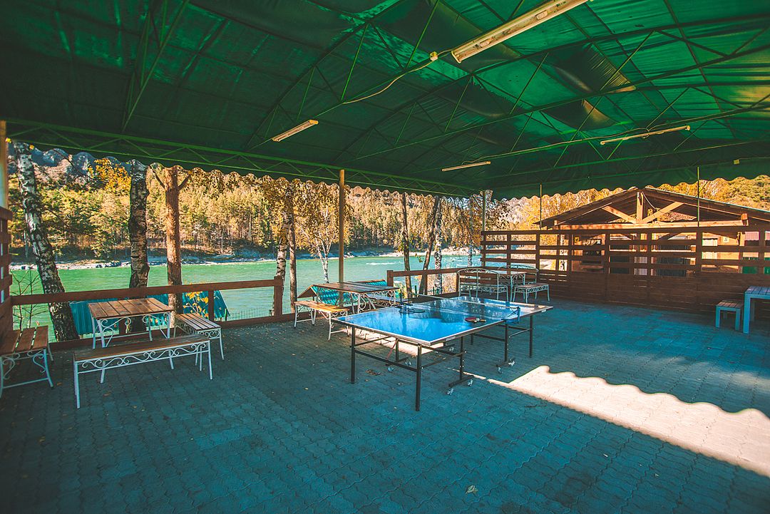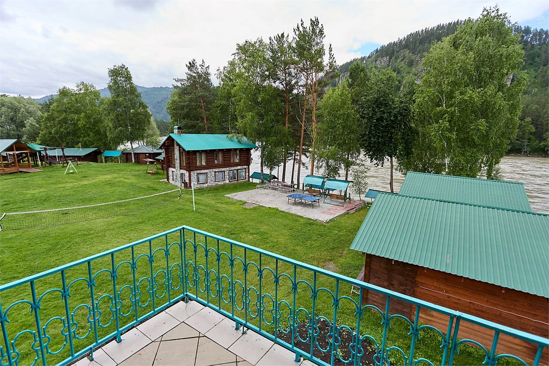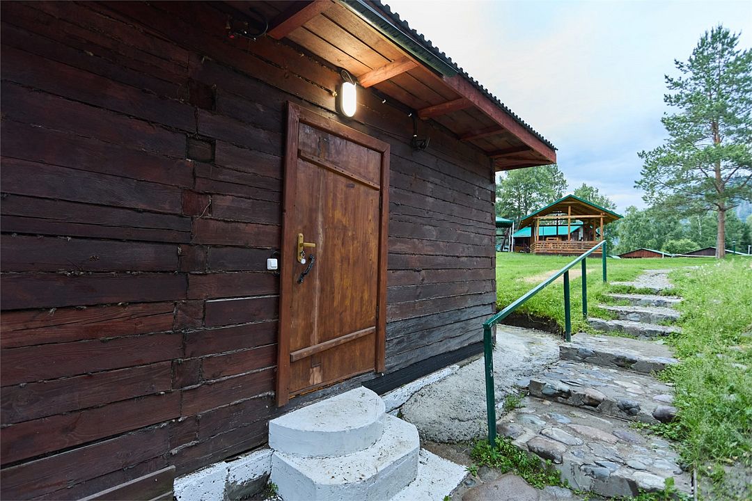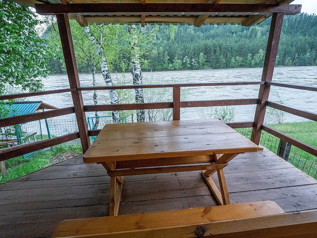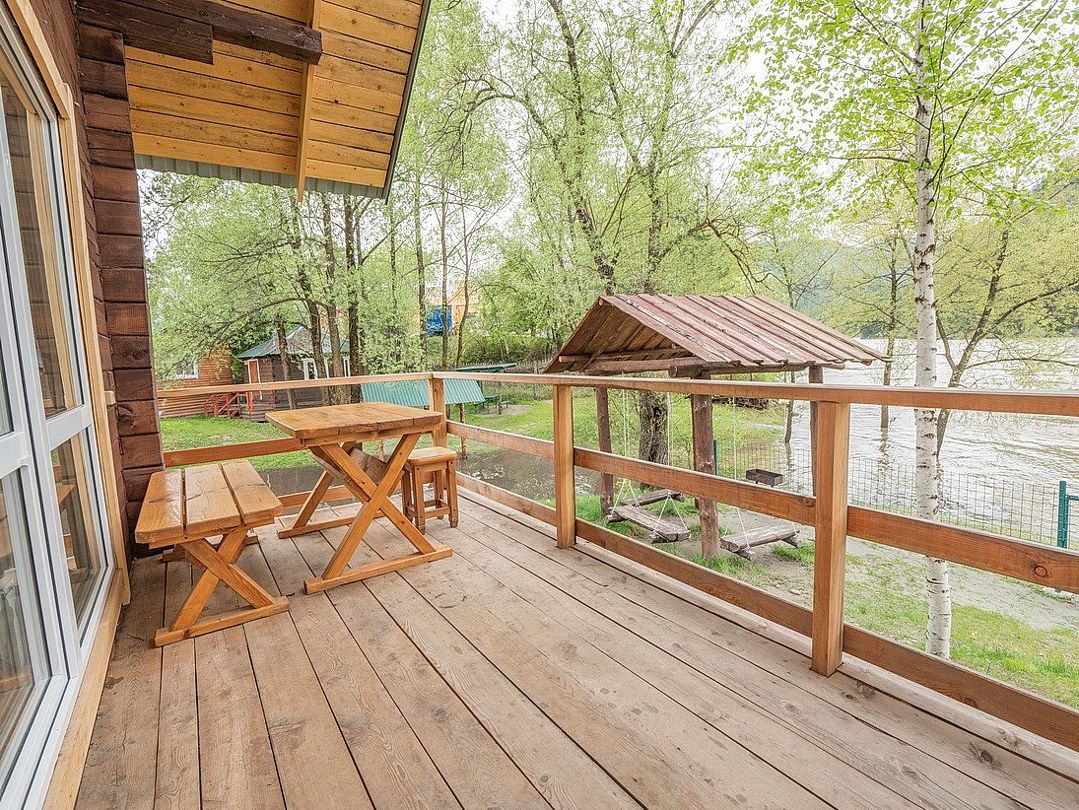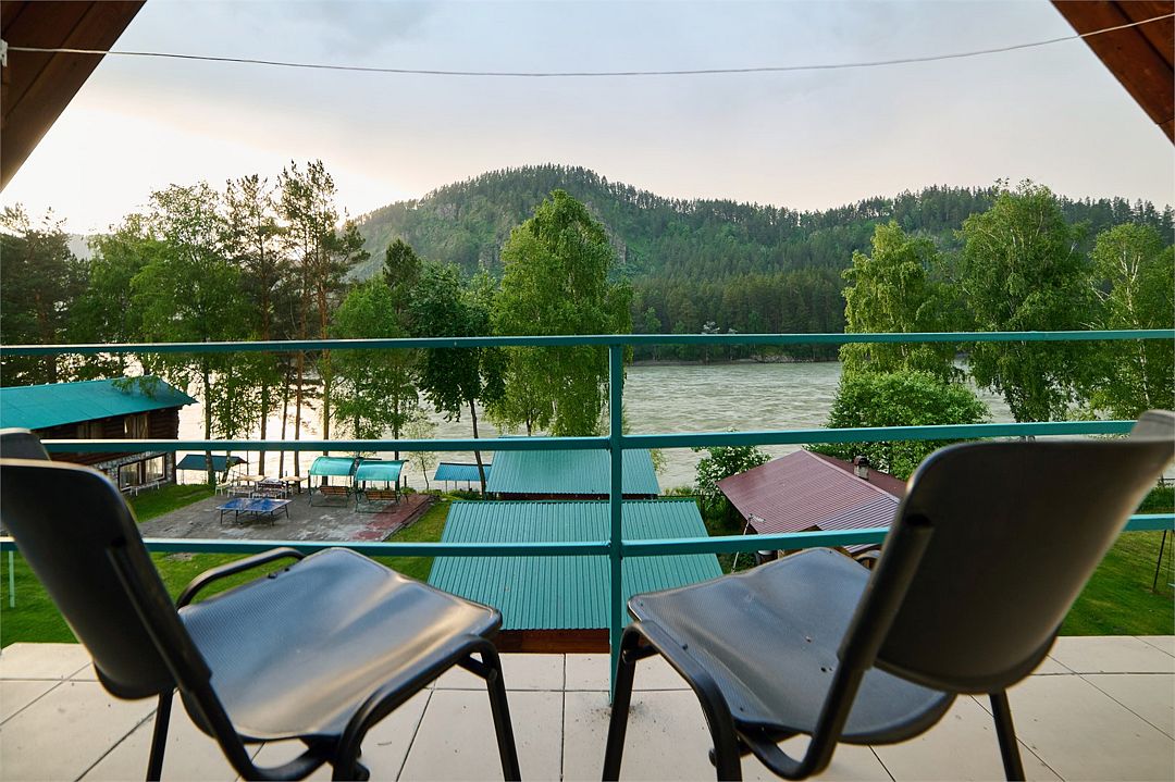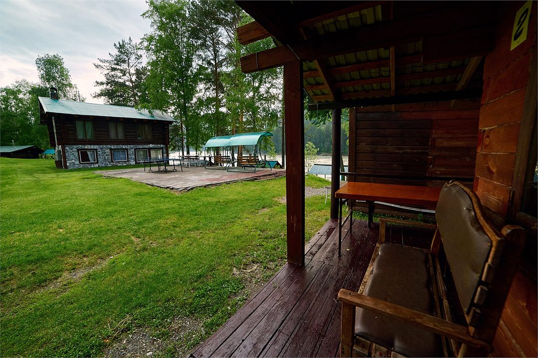 Номер внутри двора базы, с общей террасой и видом на речку Баранголку, которая протекает по территории базы и впадает в р. Катунь.Услуги и удобства