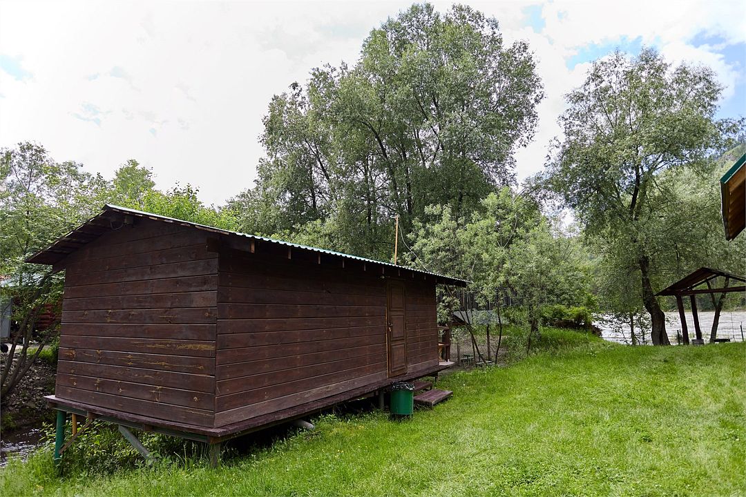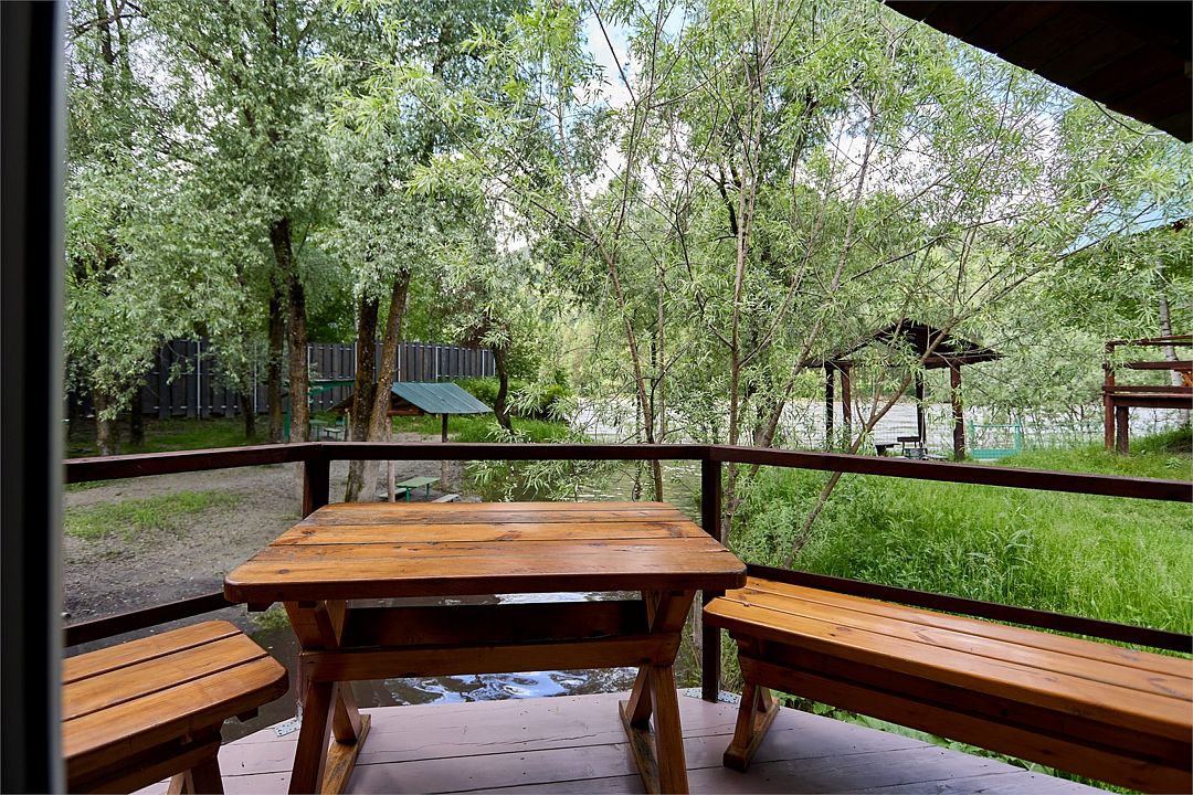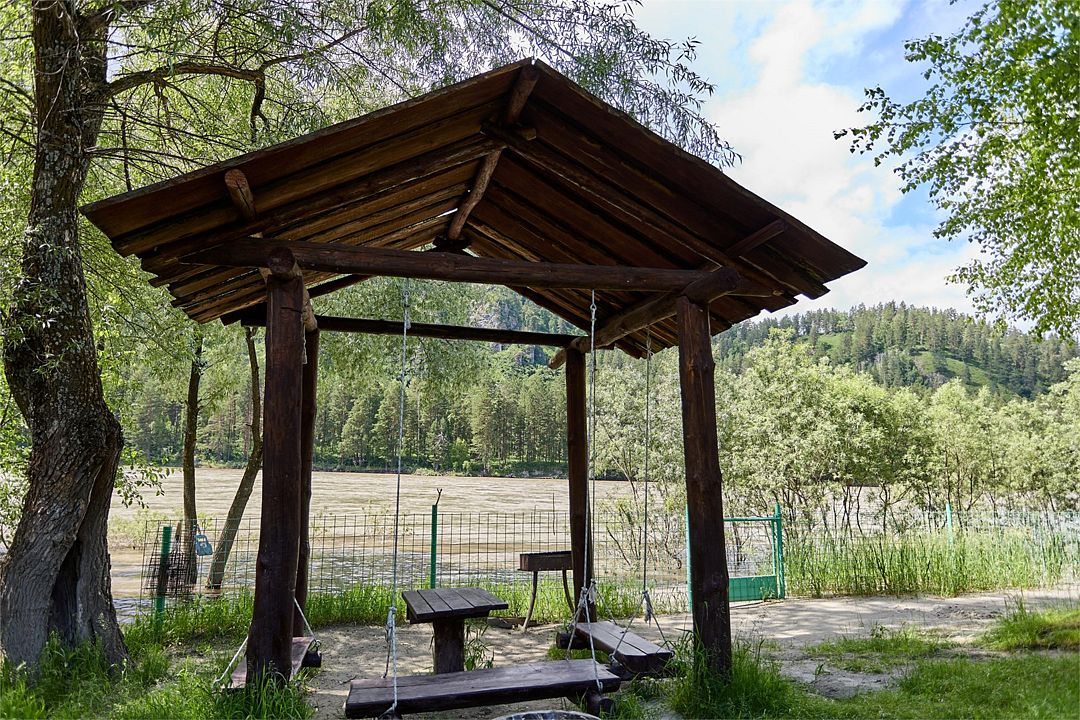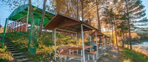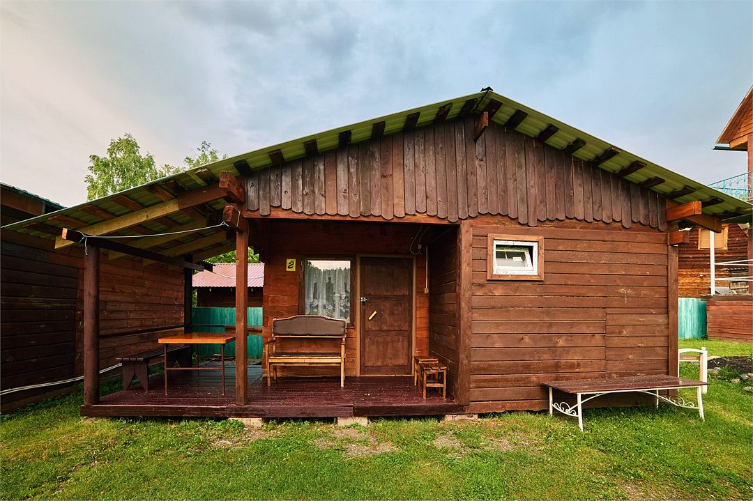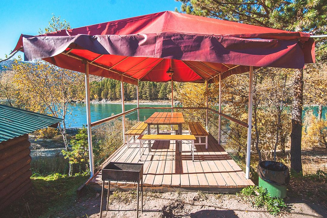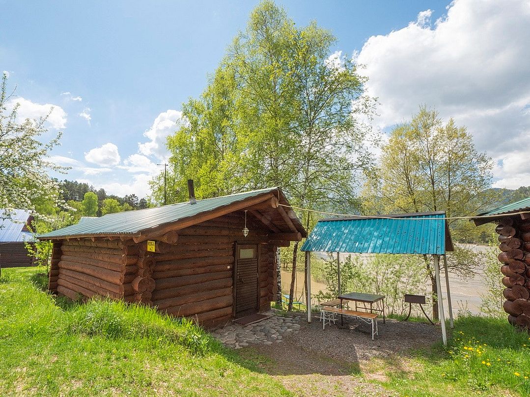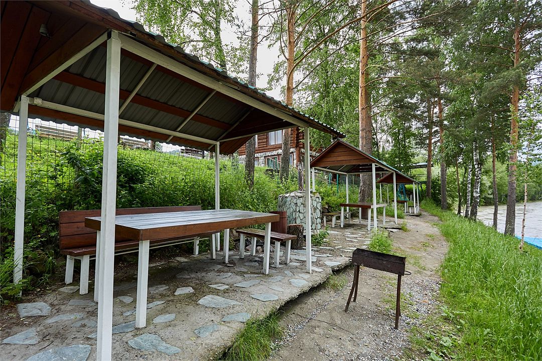 Номер внутри двора базы, с общей террасой и видом на речку Баранголку, которая протекает по территории базы и впадает в р. Катунь.Услуги и удобства