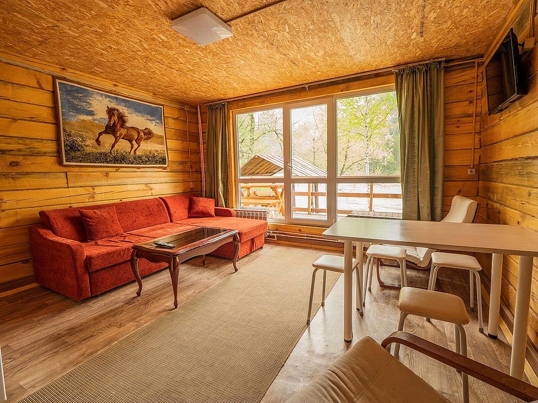 телевизор, спутниковое телевидение, водонагреватель, двуспальная кровать, стулья, вешалки, журнальный столик, обеденный стол, зеркало, ковер, две комнаты, камин, набор посуды, чайник, раковина, обеденная зона, отдельный вход в номер, душ, вид на реку, высокие потолки, стаканы, столовые приборы, туалетные средства, туалет, мангал, раскладное кресло, мини-холодильник, вид на горы, номер для некурящих, вид на лес, кресло-кровать, межкомнатная дверь, уборка номера, мыло, можно с питомцамиВ домике