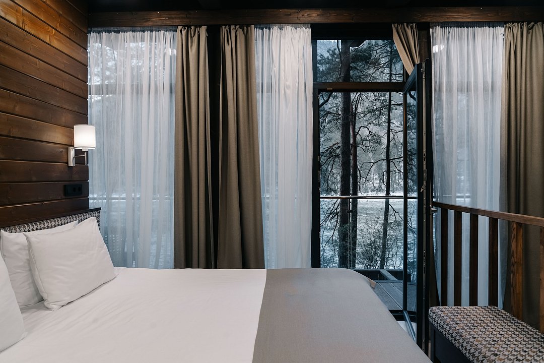 Просторный номер категории Супериор дабл в гостевом доме с панорамным окном, отдельным входом и тамбуром.