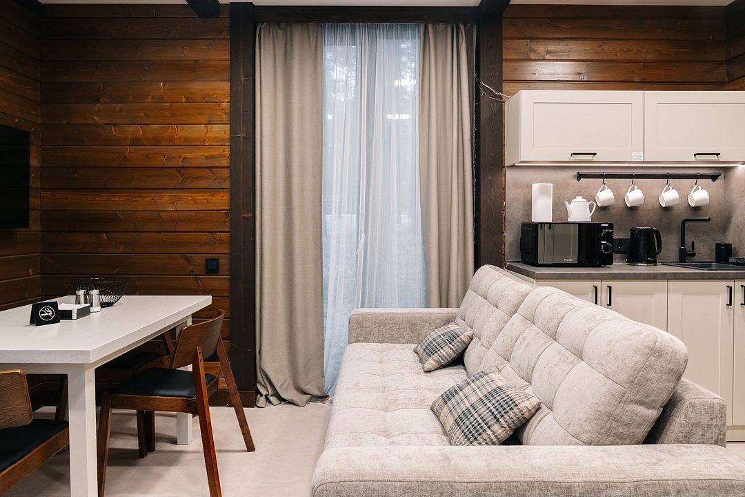 Просторный номер категории Полулюкс в новом гостевом доме с панорамными окнами, гостиной с кухонной зоной, спальной комнатой и отдельным входом с тамбуром.
