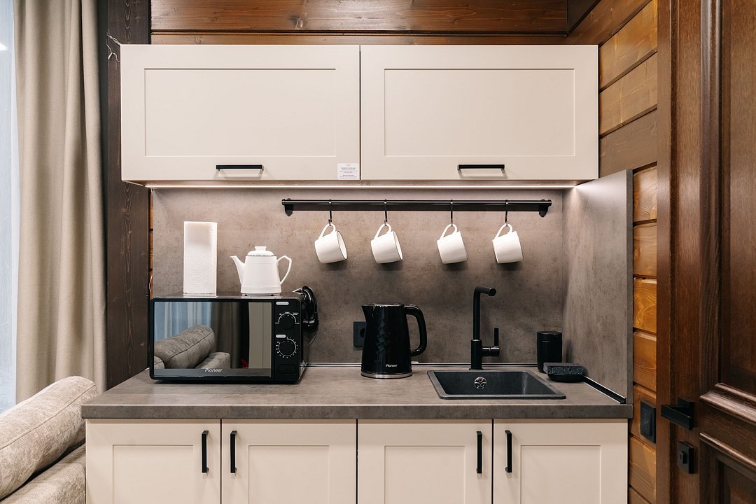 Номер включает в себя: кухню‑гостиную, комнату, 2 санузла, отдельный вход, балкон, террасу с чаном-купелью. Спальные места: кровать king-size (1,8*2,0 м) или две односпальные кровати (0,9*2,0 м), диван-кровать. Возможность размещения дополнительного места и детской кроватки — уточняйте у администратора. Балкон: 2 кресла, столик.