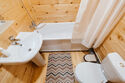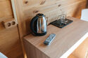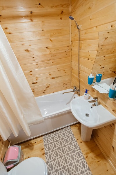 Однокомнатный домик с телевизором, холодильником и ванной комнатой.