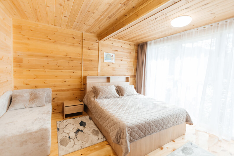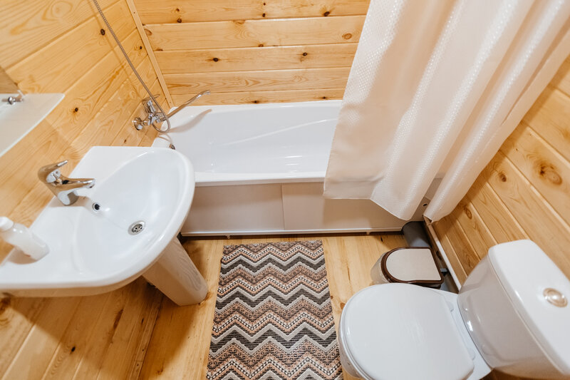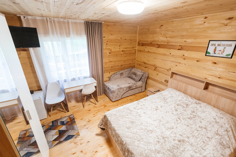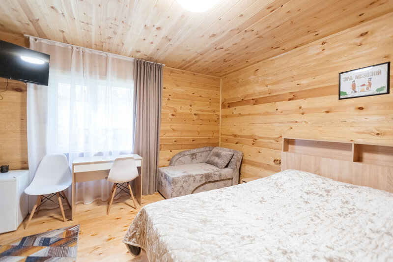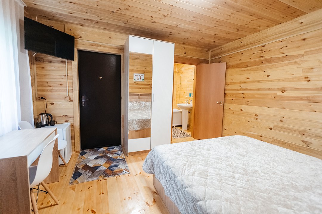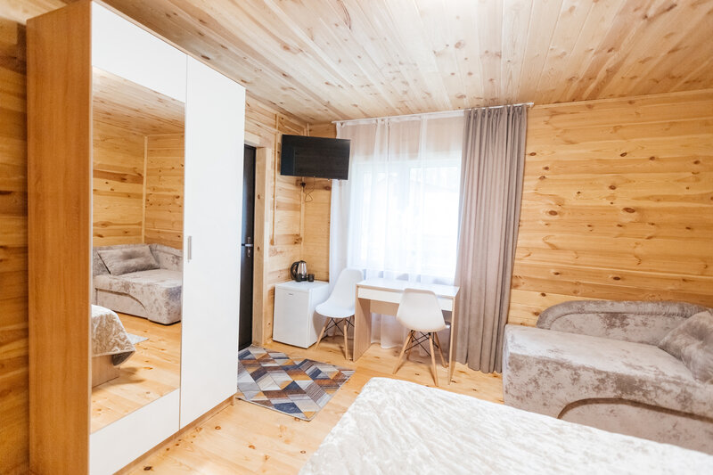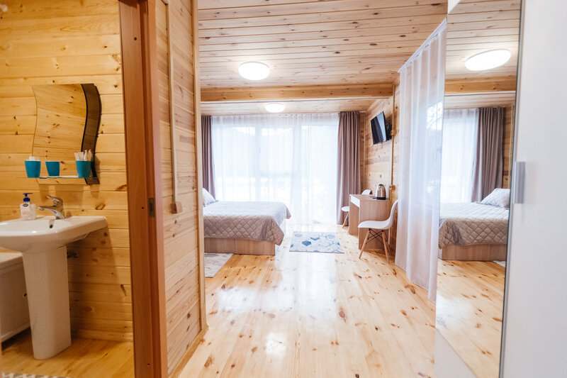 Уютные дома оборудованы всем необходимым. Имеется двуспальная кровать и односпальный диван, телевизор, холодильник и набор посуды. Собственная ванная комната оснащена стандартным набором сантехники и феном. У каждого домика имеется индивидуальная беседка с мангалом и проточной водой.