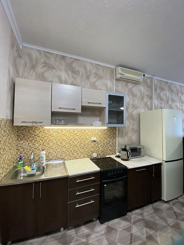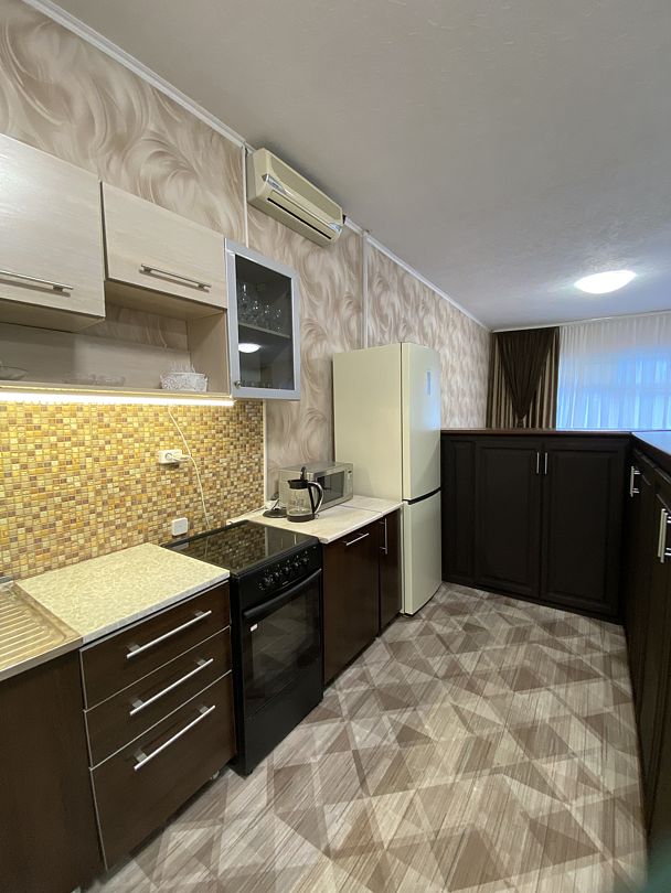Кухня оборудована холодильником, электрической плитой с духовым шкафом, микроволновой печью, вся посуда для приготовления еды, столовые приборы.