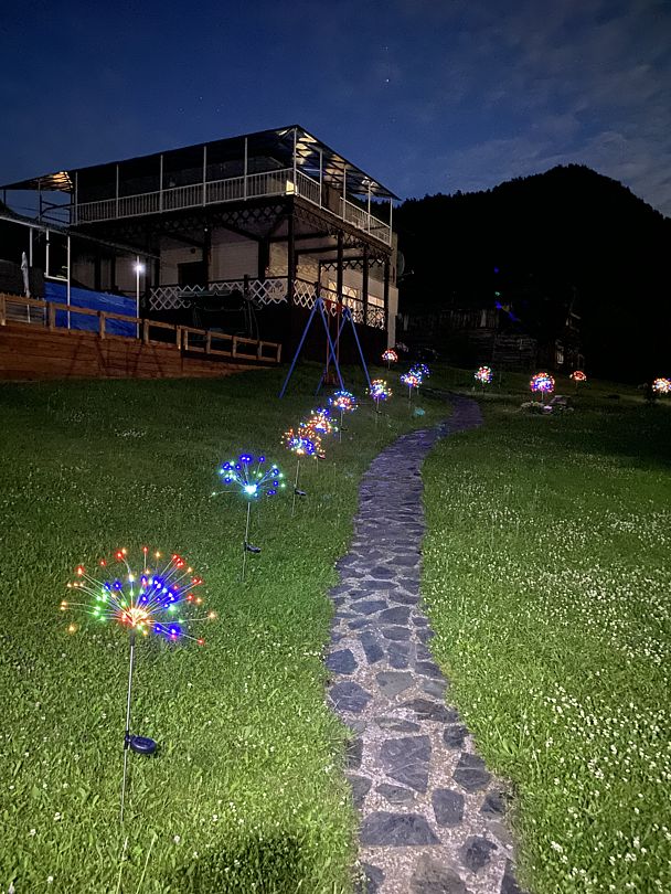 Дом оборудован кухней, тёплым душем, а также подарит отдыхающим потрясающий вид на горы.