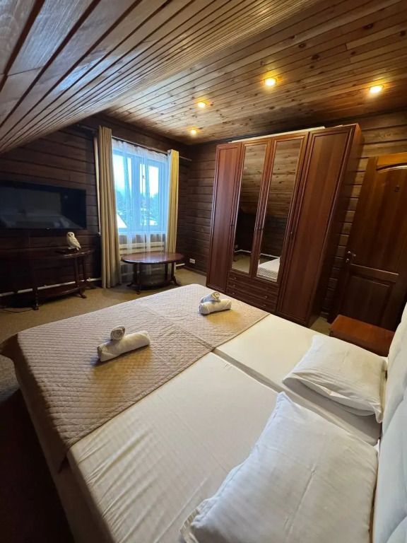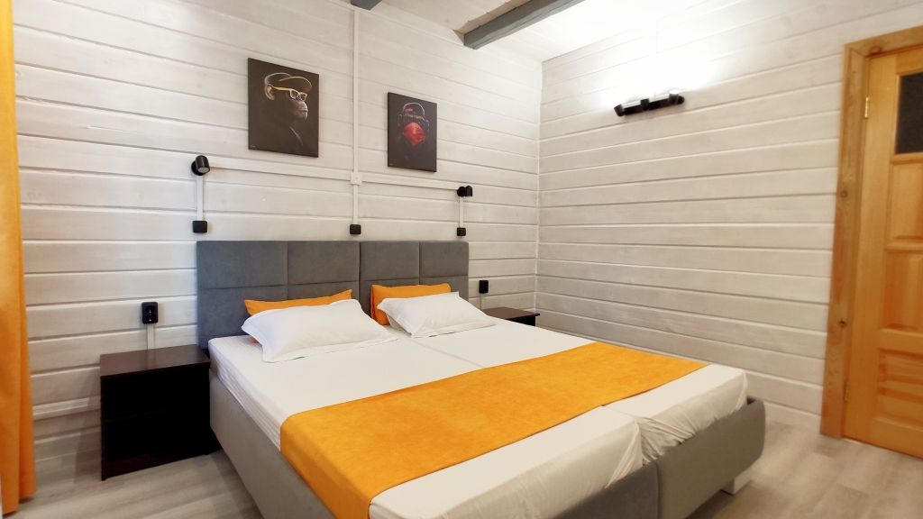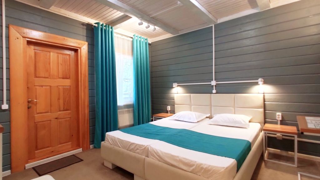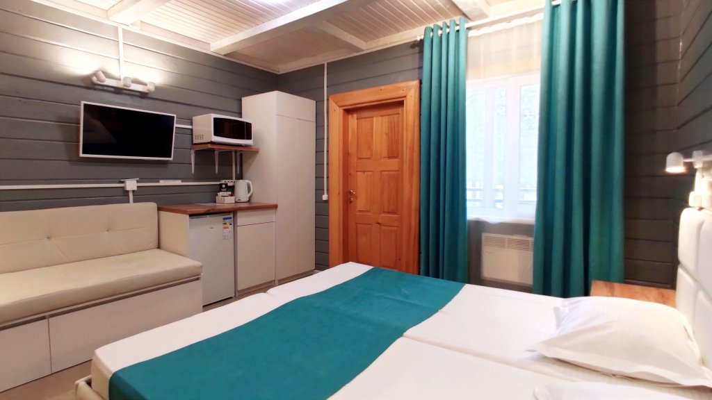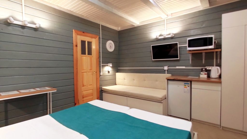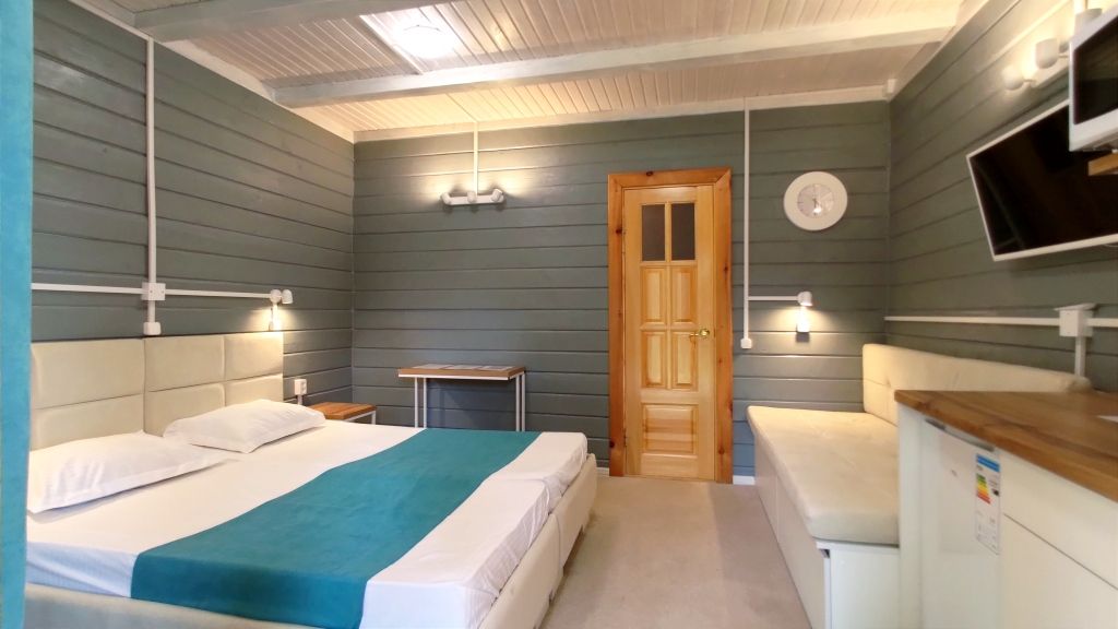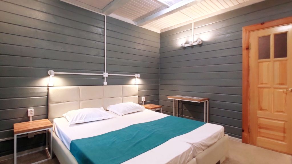 Четыре номера такого плана на втором этаже расположены рядом, вход на этаж отдельный. Удобства в номере - душевая кабина, туалет, фен для волос, 2е односпальные кровати соединённые вместе (нет щелей между матрасами), стол обеденный, стол разделочный 2 тумбочки/табурета, шкаф, диван-софа, холодильник, смарт ТВ, чайник, минимальный набор посуды, СВЧ печь.