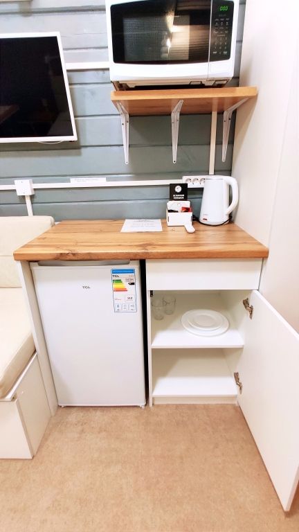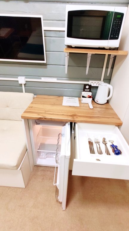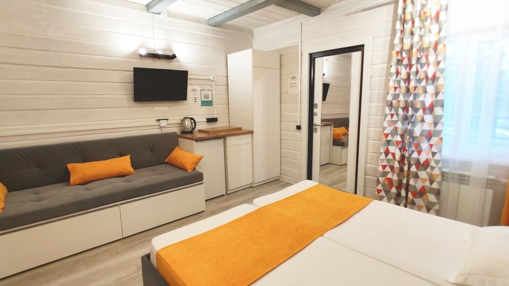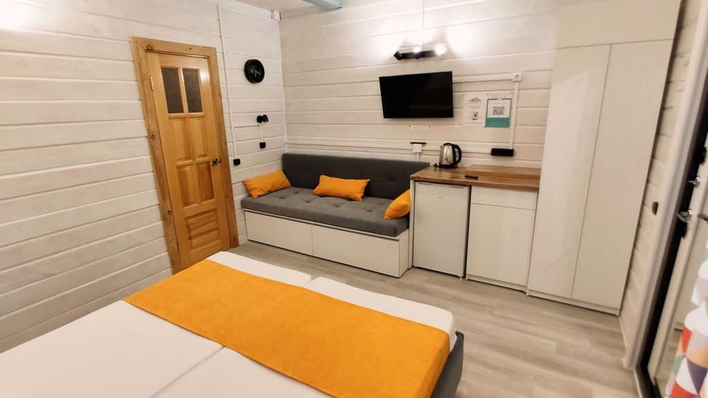 Четыре номера такого плана на первом этаже расположены рядом, вход на этаж отдельный. Удобства в номере - душевая кабина, туалет, фен для волос, 2е односпальные кровати соединённые вместе (нет щелей между матрасами), стол обеденный, стол разделочный 2 тумбочки/табурета, шкаф, диван-софа, холодильник, смарт ТВ, чайник, минимальный набор посуды, СВЧ печь.