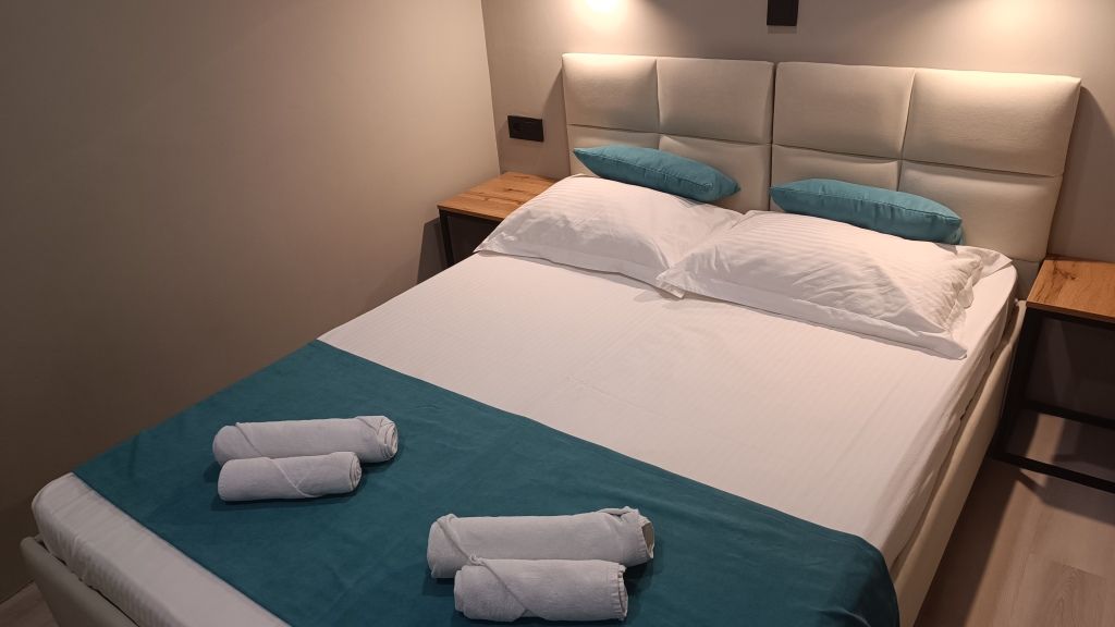 Небольшой номер на 12 м2 с двумя односпальными кроватями, сдвинутыми вместе по умолчанию. Щелей между матрасами нет. и всеми удобствами. В номере душ и туалет. Есть умный телевизор. Для гостей этого номера доступна терраса с уличной мебелью.