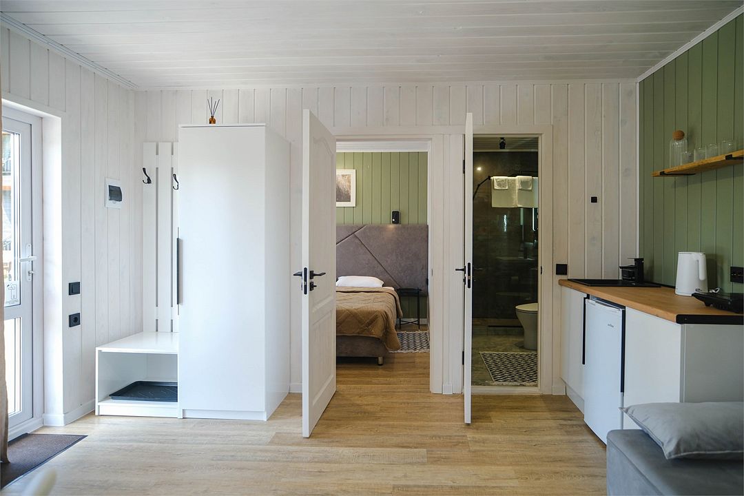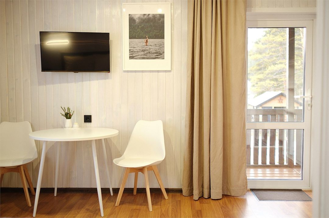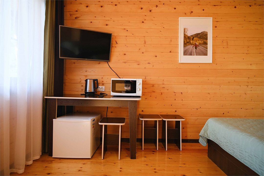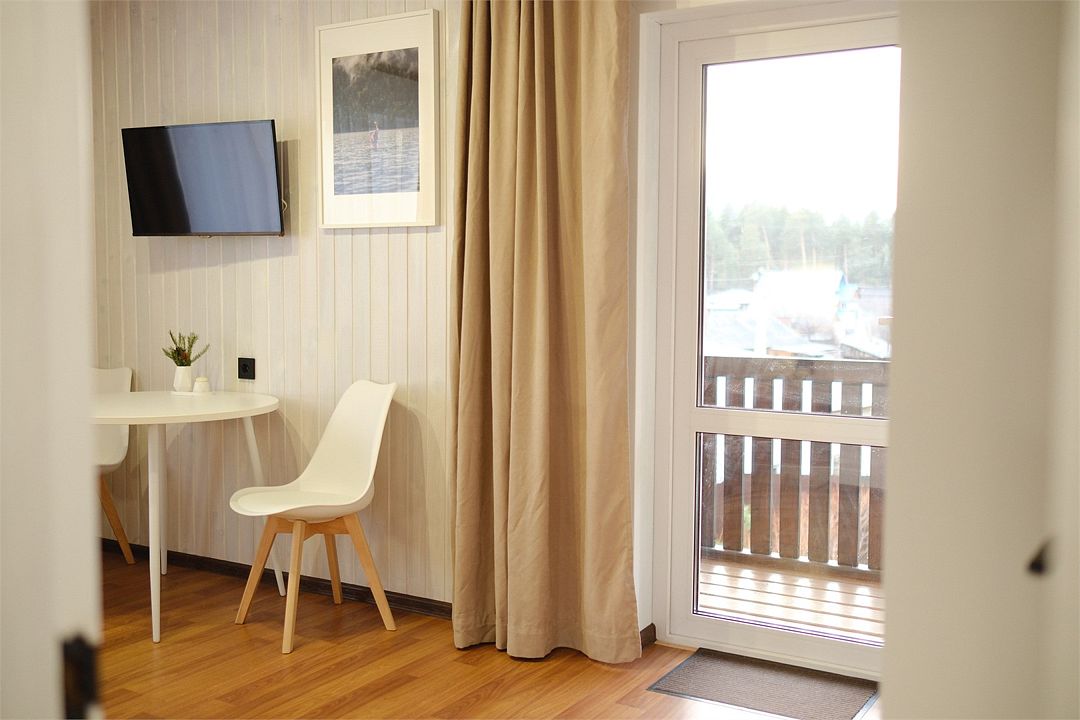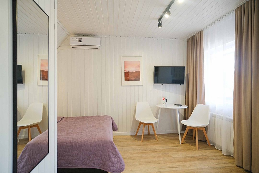 Однокомнатный двухместный номер с идеально продуманным дизайном и всеми необходимыми удобствами, расположенный в двухэтажной гостинице. В номере: двуспальная кровать, обеденный стол, шкаф для одежды, мини-кухня (холодильник, чайник, микроволновая печь, набор посуды).