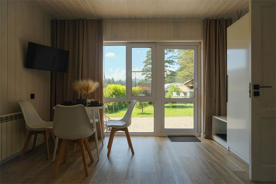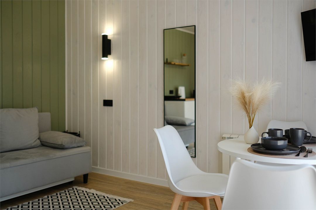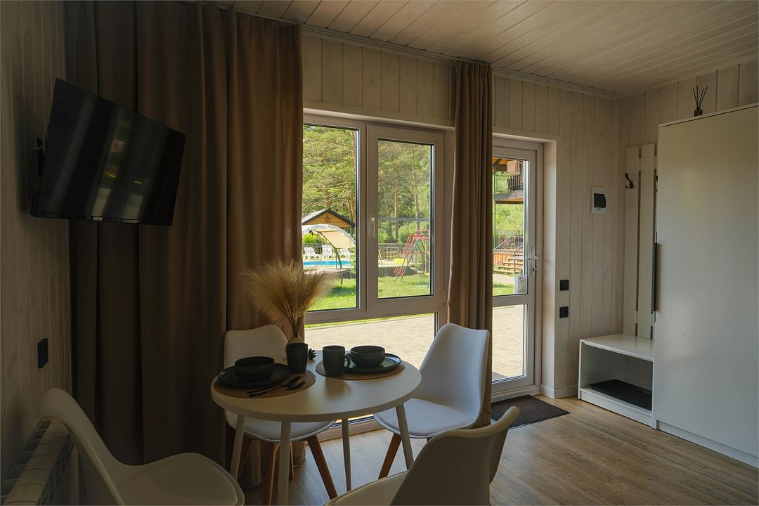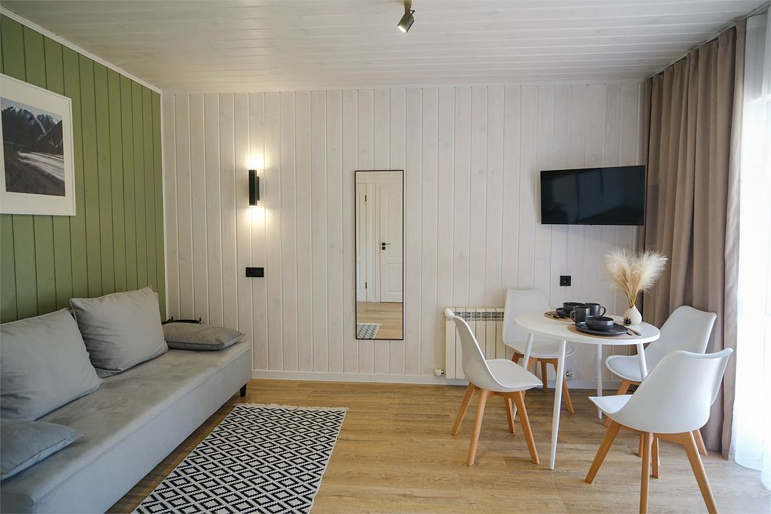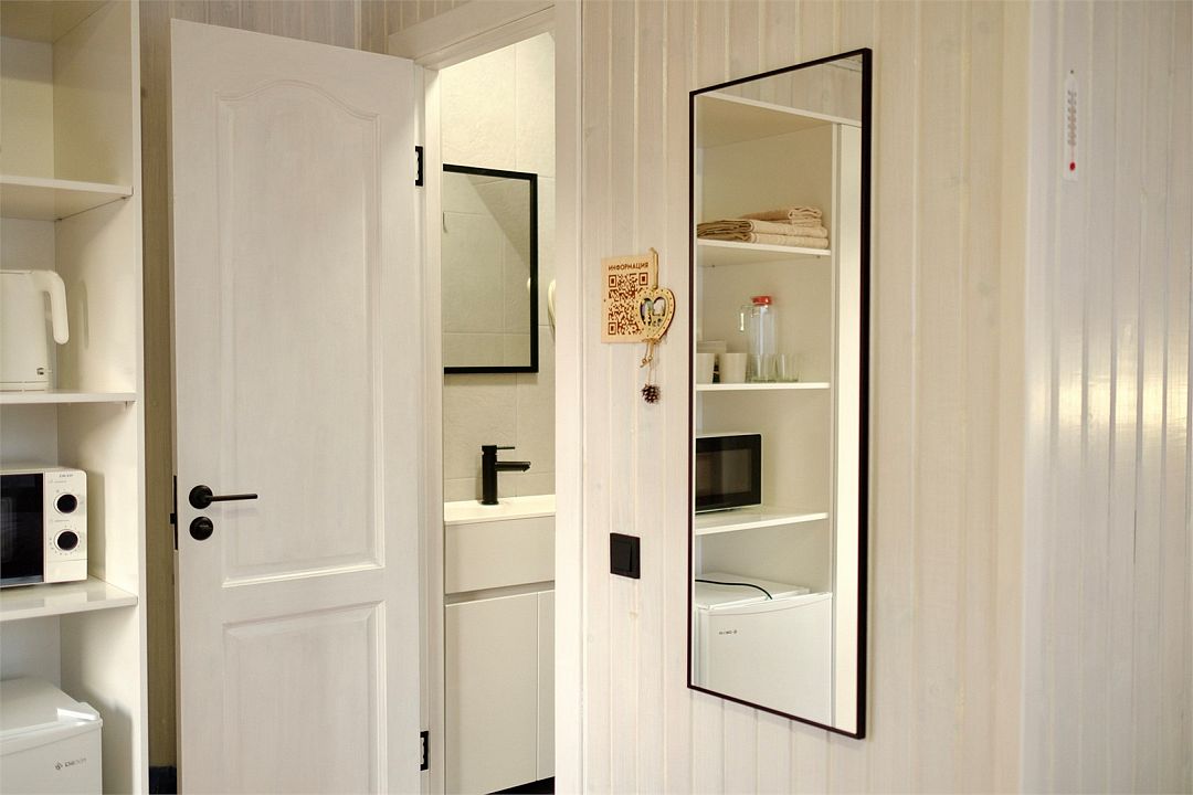 Однокомнатный двухместный номер с идеально продуманным дизайном и всеми необходимыми удобствами, расположенный в двухэтажной гостинице. В номере: двуспальная кровать, обеденный стол, шкаф для одежды, мини-кухня (холодильник, чайник, микроволновая печь, набор посуды).
