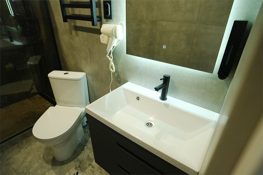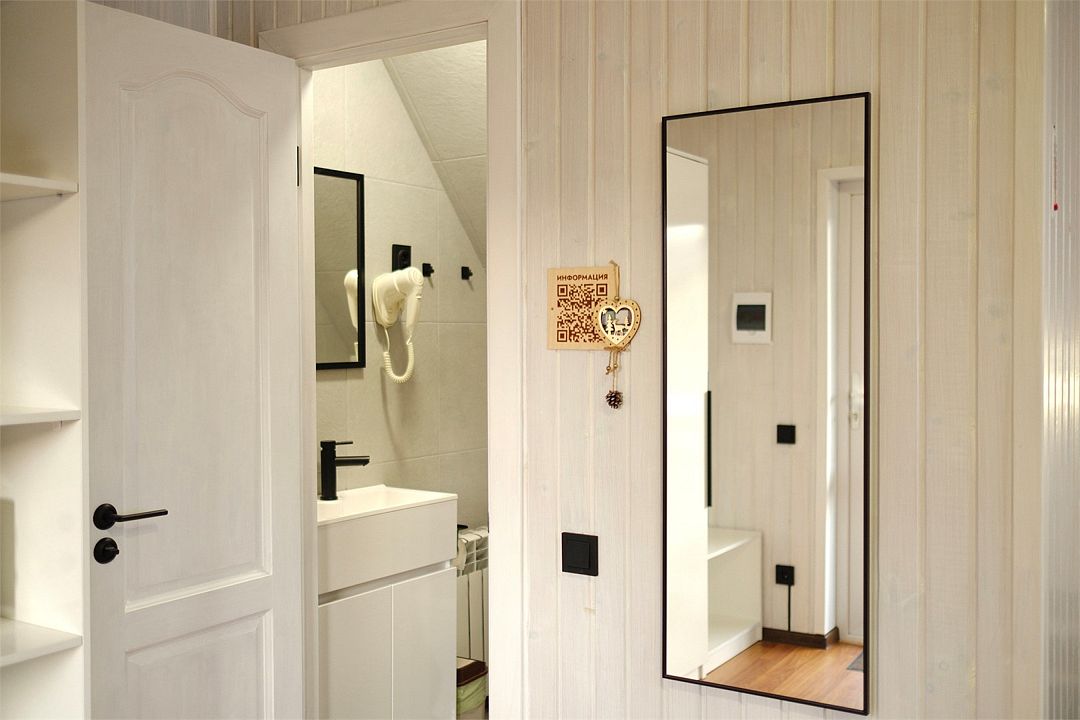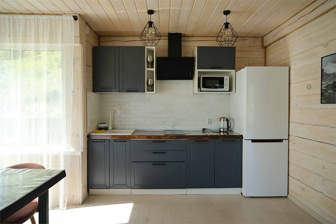 Кухня: кухонный гарнитур, холодильник, индукционная плита, чайник, микроволновая печь, столовая посуда, столовые приборы. Совмещенный санузел: душ, туалет, раковина, набор полотенец (для каждого гостя), халат и тапочки (для каждого гостя), мыло, гель для душа, шампунь для волос, фен.