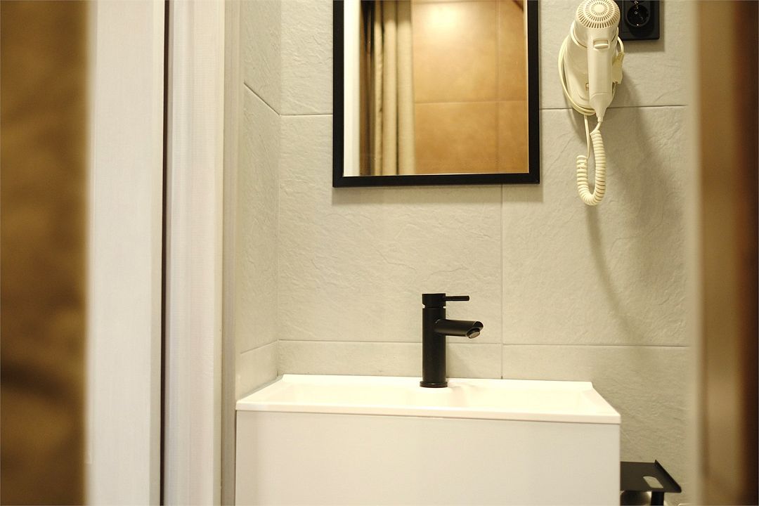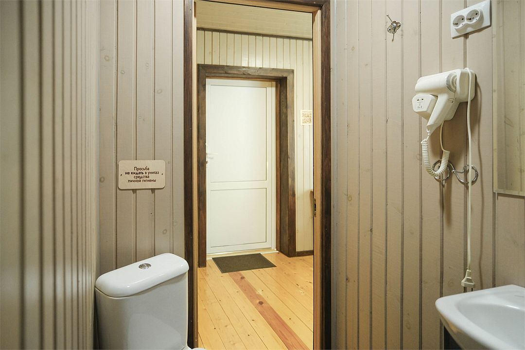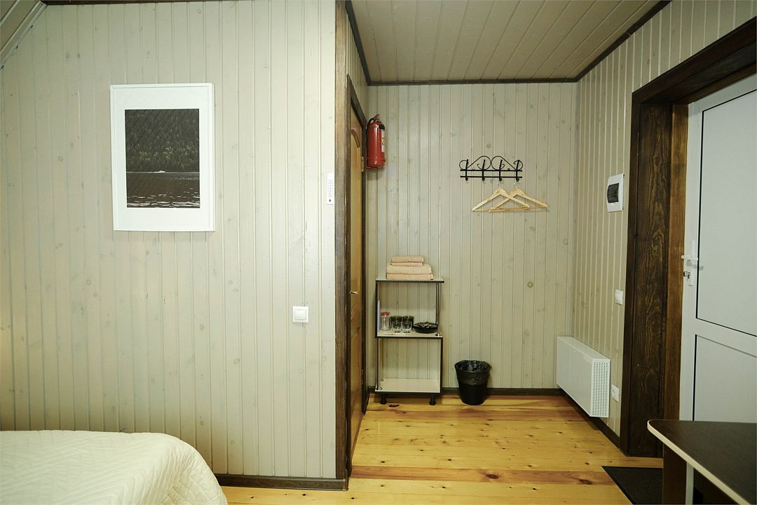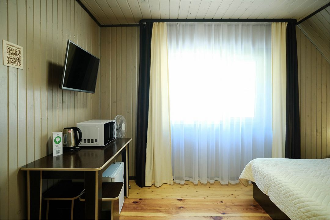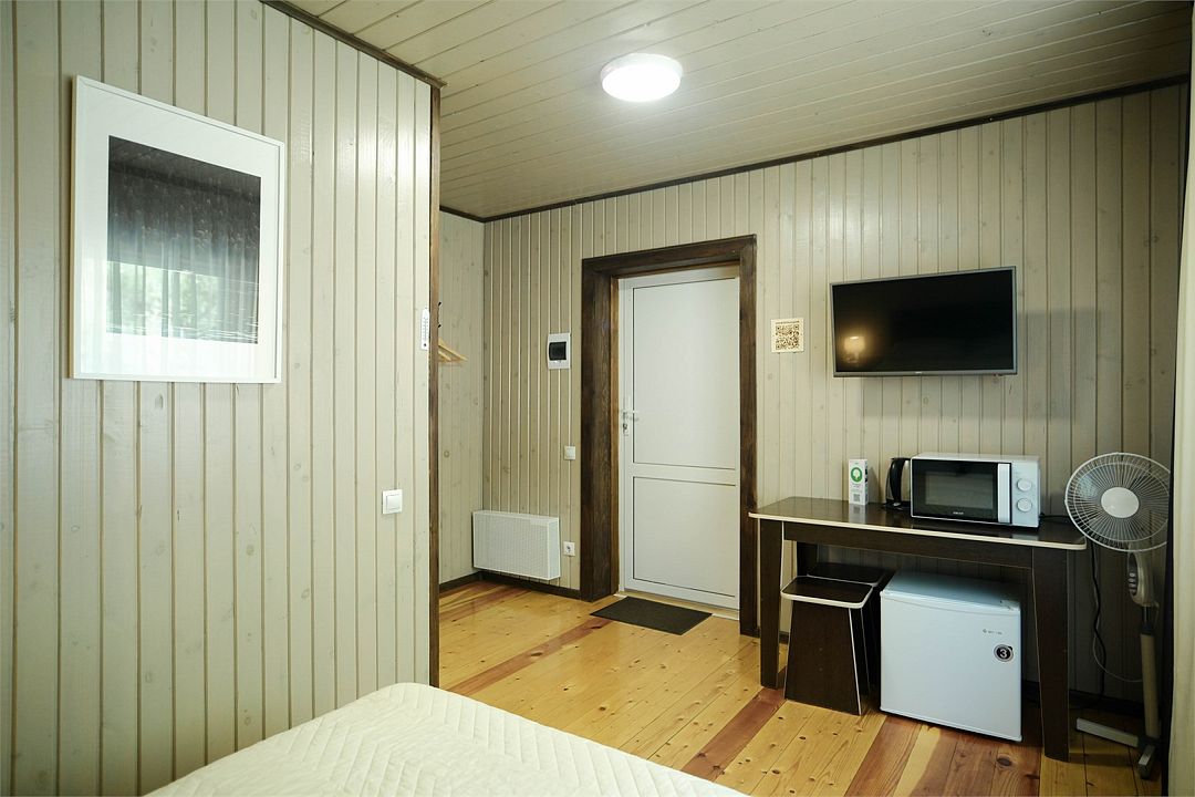 Просторный однокомнатный номер в общем корпусе на первом этаже с видом во двор. Двуспальная кровать, ванная комната, TV, холодильник, чайник, фен, микроволновка, полотенца, гостиничные средства гигиены, Wi-Fi.