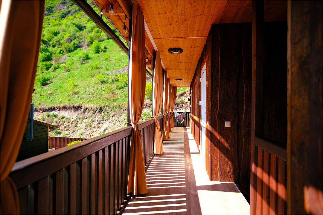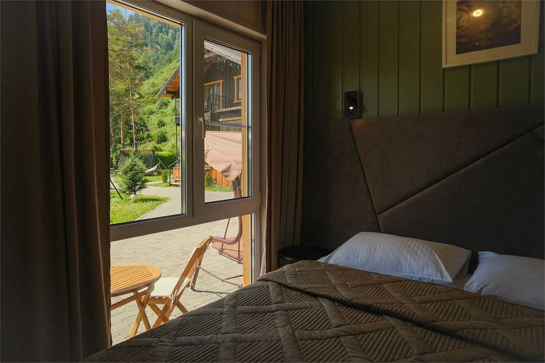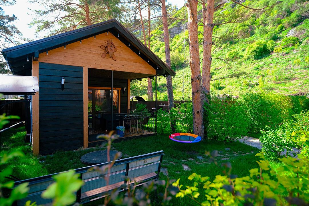 Двухкомнатный дом с панорамным видом во двор, спальная комната, гостиная, ванная комната, открытая терраса, мангальная зоной рядом с домом.