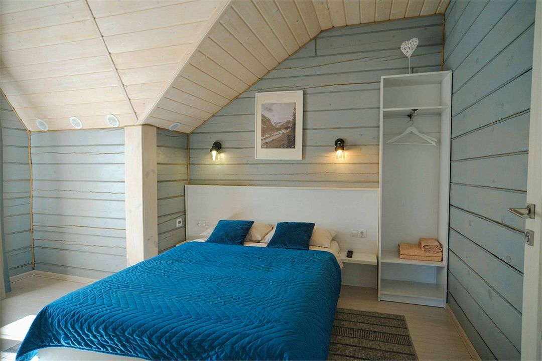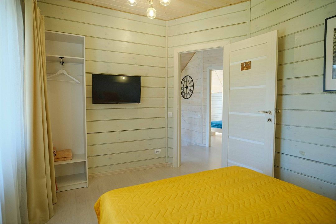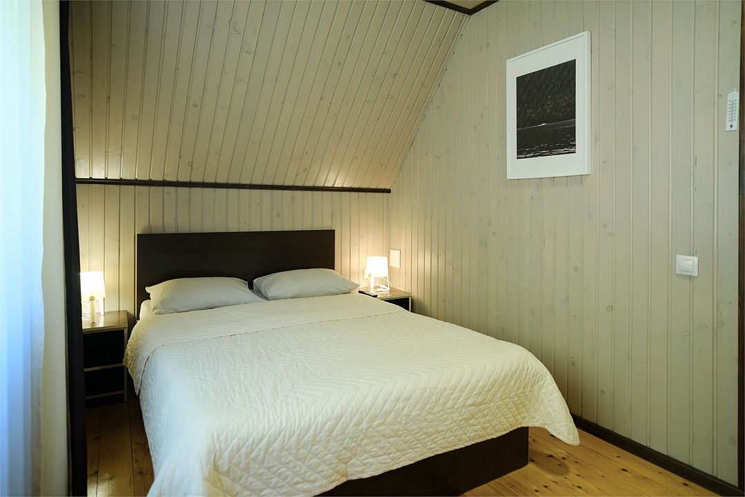 Спальня: одна двуспальная кровать размера King Size или две односпальные кровати, две прикроватные тумбы, две индивидуальные лампы, панорамное окно во двор усадьбы. Гостиная: двуспальный диван-кровать шириной, обеденный стол, четыре стула, телевизор и шкаф для одежды.