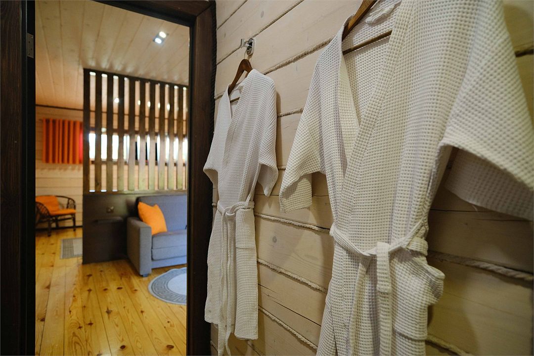 Двуспальная кровать, диван (раскладывается на два полноценных места), теплый пол, телевизор, микроволновая печь, холодильник, чайник, чайный набор, полотенца, халаты, тапочки, фен.