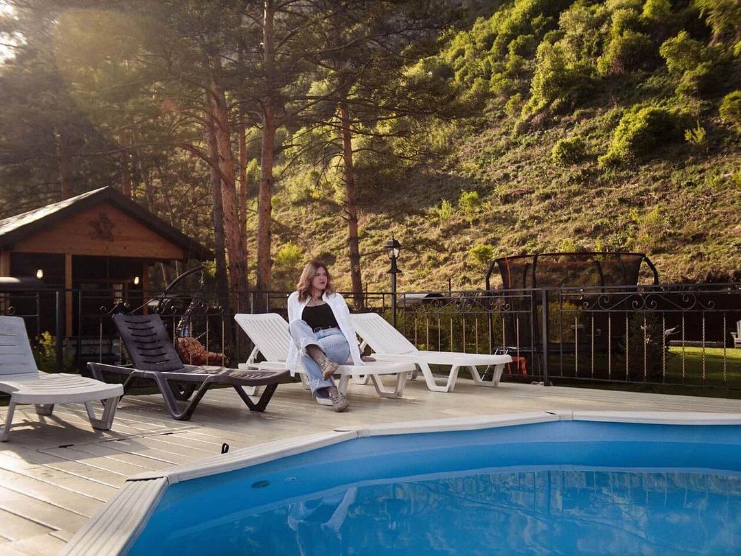 Читать полностьюВ «Усадьбе Зорькиных» вас ожидает настоящее летнее блаженство: терраса с подогреваемым бассейном, с которой открывается потрясающий вид на горный пейзаж. Уютные шезлонги и зона отдыха приглашают вас провести время в тишине и спокойствии, наслаждаясь лазурным небом.