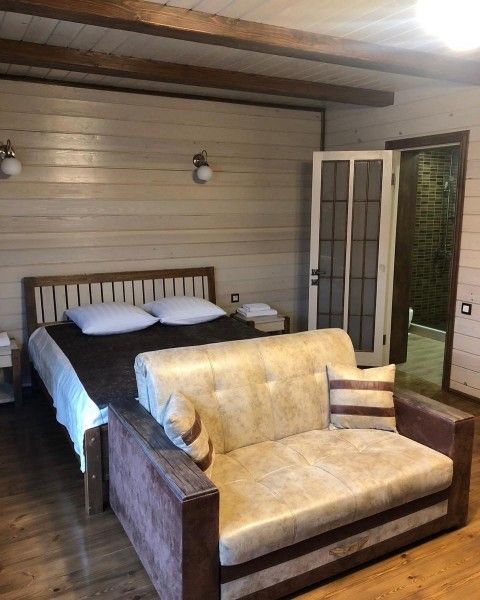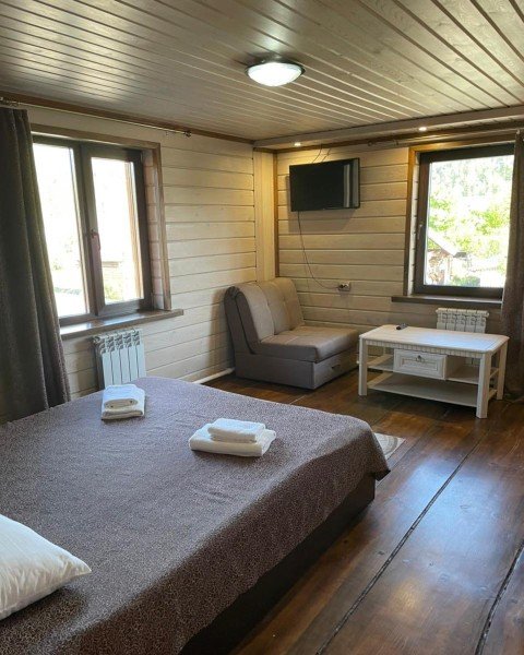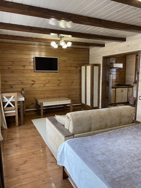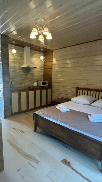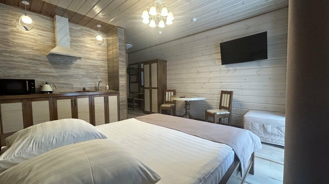 Для отдыха семейной пары доступна комфортная студия, а для компании друзей — коттедж с двумя спальнями. Современные и просторные номера обустроены комфортабельной мебелью, включающей большую кровать, диван, телевизор и фен.