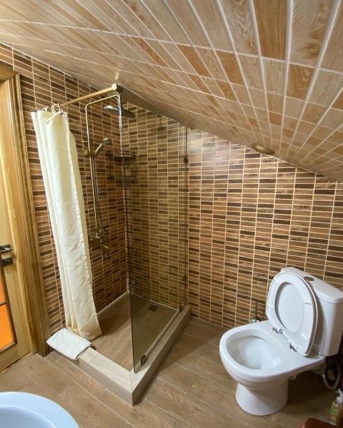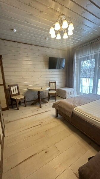 В каждой спальне двуспальная кровать, диван, телевизор, душ, туалет. В доме обустроена кухонная зона со всей необходимой техникой и посудой. Есть балкон и веранда.