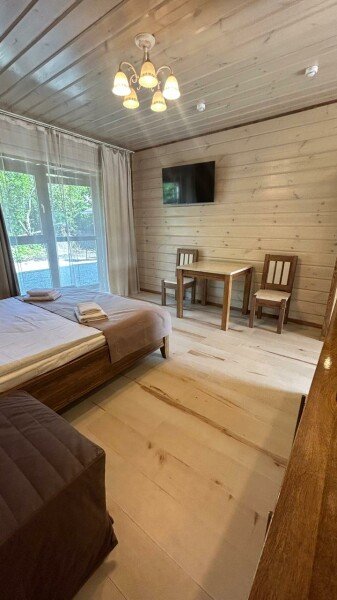 В номере обустроенная кухонная зона, со всей необходимой посудой и техникой. Двуспальная кровать, диван, телевизор. У номера отдельный вход с улицы и терраса с видом на бассейн.