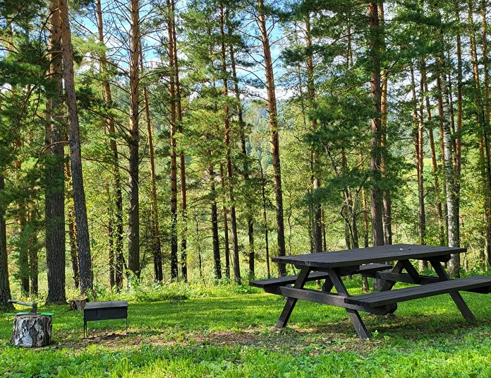 В распоряжении отдыхающих мангальные зоны для приготовления шашлыка и барбекю, бесплатная парковка и бесплатный скоростной интернет на всей территории. Глэмпинг оборудован качелями, гамаками, зонами для прогулок. После активного отдыха можно расслабиться на уютной террасе, наслаждаясь потрясающими видами на горы, лес и реку. Для уютных посиделок у костра в кругу семьи или друзей есть специальная костровая зона, обустроенная на небольшом острове посреди быстрой горной реки Узнезя.