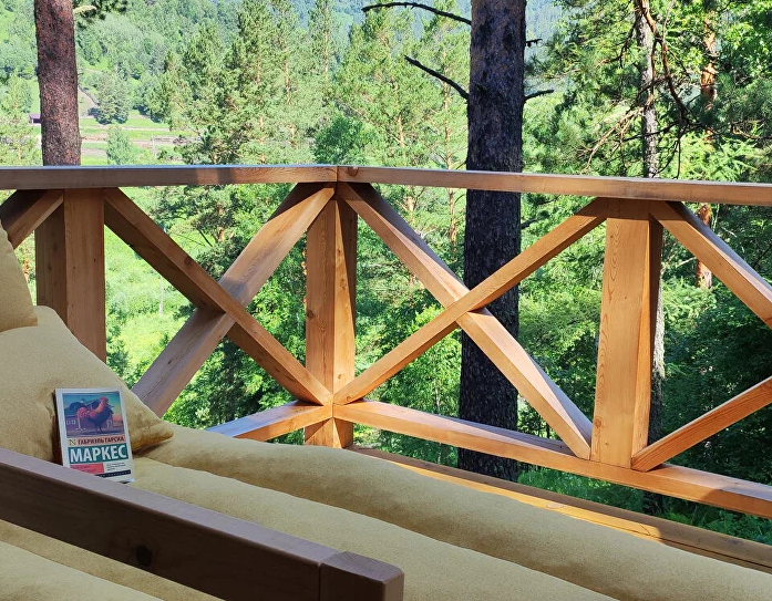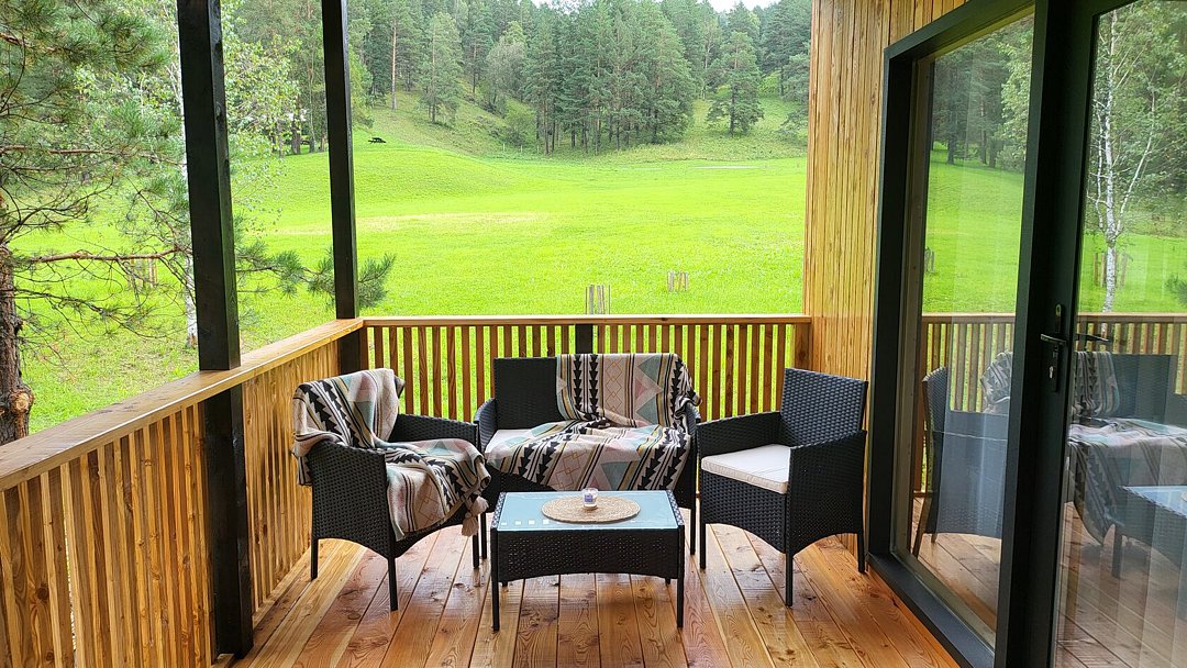 Просторная терраса с уютными креслами и тёплыми пледами позволит провести незабываемые вечера в семейном кругу. Наслаждайтесь красивыми видами, отдыхайте и создавайте.