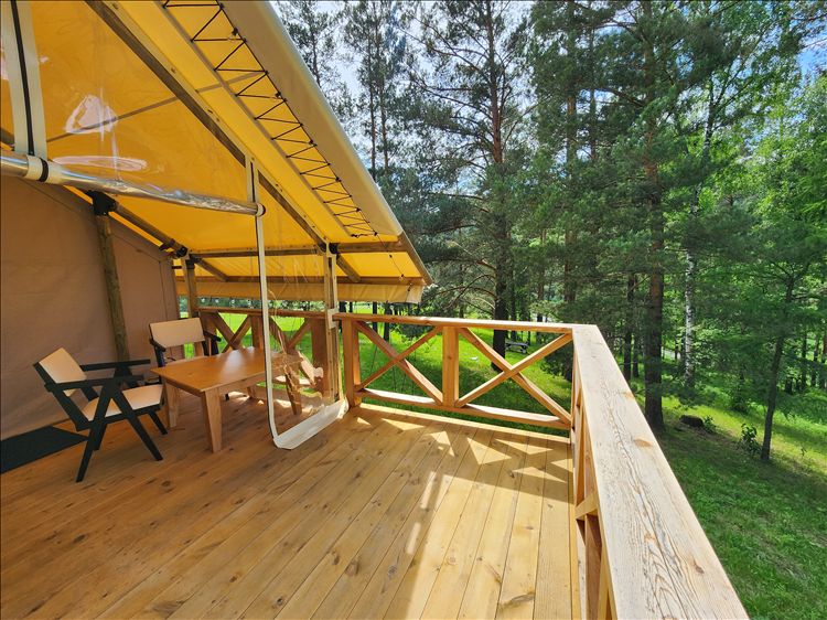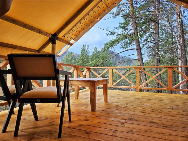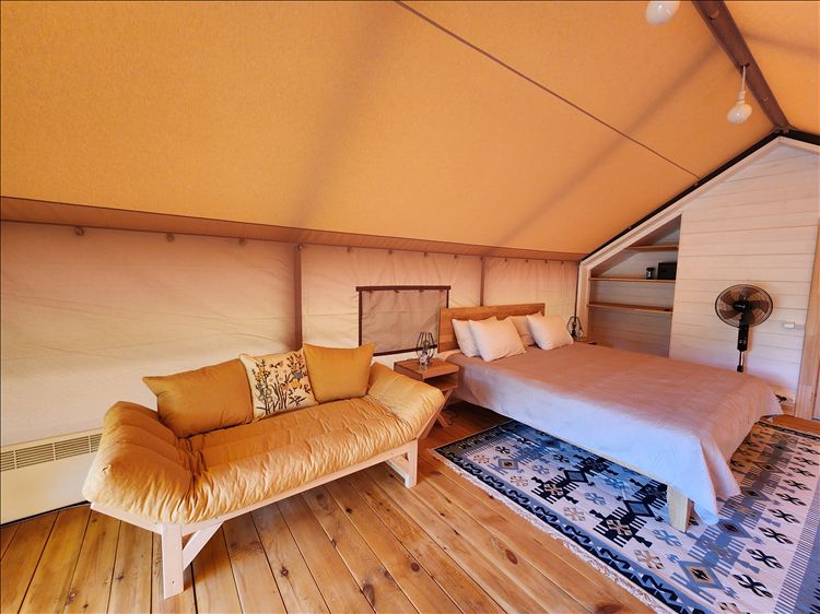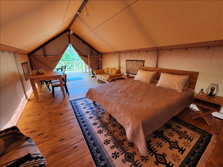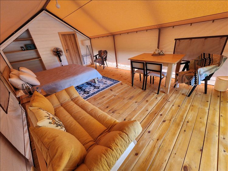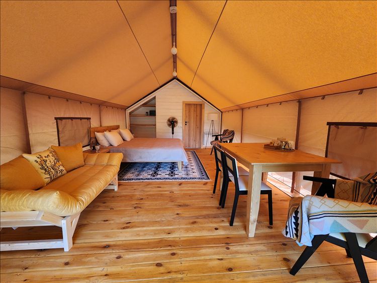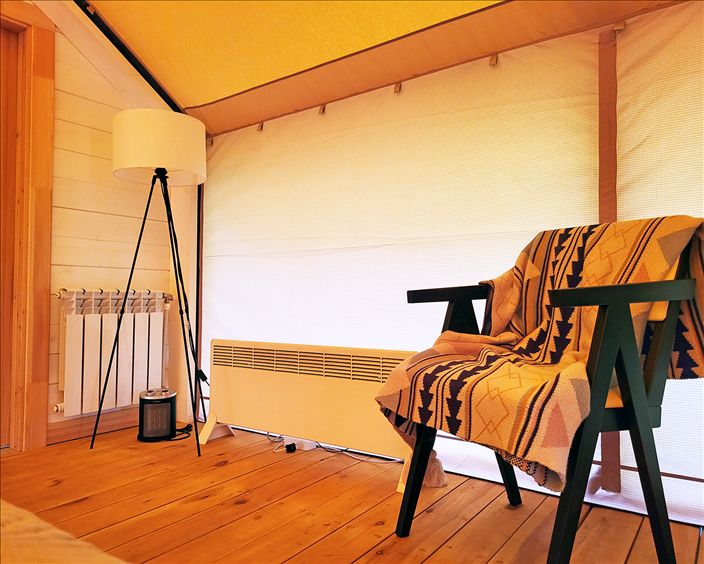 Отапливаемый сафари-тент с лаконичным дизайном в природных тонах, позволяющий с комфортом разместиться семье из 4х человек.