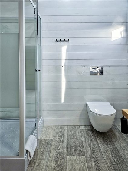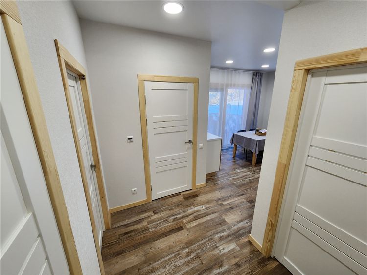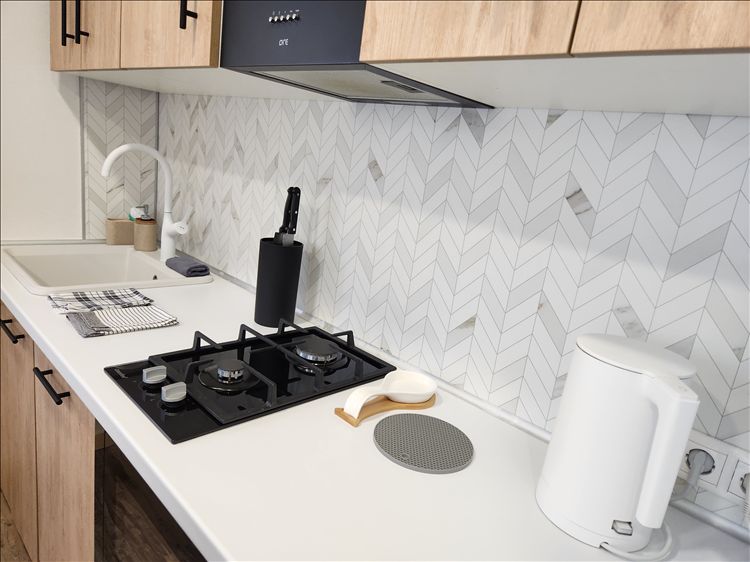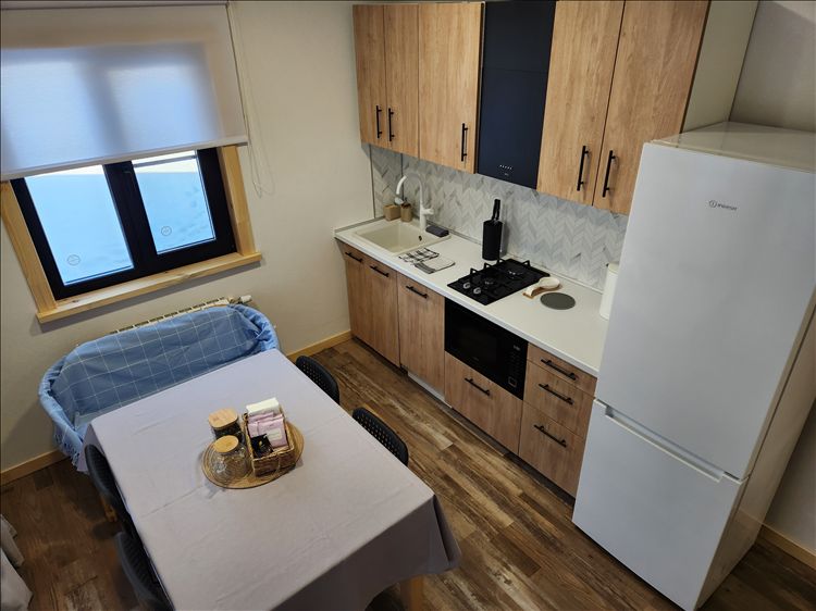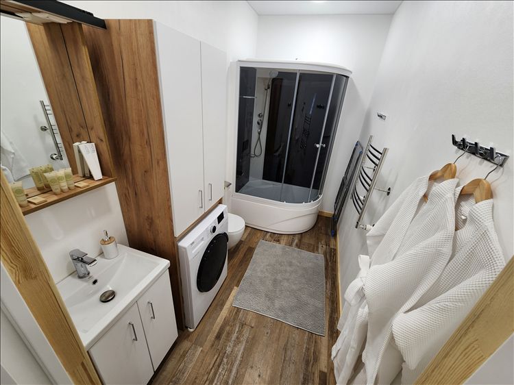 В апартаментах есть собственные кухня (газовая плита, электрический чайник, посудомоечная машина, микроволновка, большой холодильник, посуда для приготовления и сервировки) и санузел с душевой кабиной и стиральной машиной. На кухне и в первой спальне есть телевизоры со Смарт-ТВ.