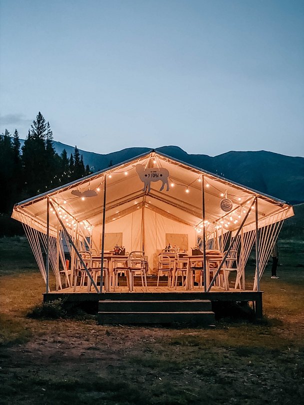 На территории глэмпинга гостей ждёт походный бар, оформленный в стиле уютного шатра, где можно насладиться блюдами алтайской кухни. Завтраки, обеды и ужины подаются в определенное время, а меню можно адаптировать под индивидуальные предпочтения. Для корпоративных мероприятий возможно забронировать весь глэмпинг и организовать различные активности — от прогулок до сплавов по рекам.
