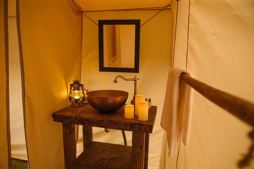 В тент-домах есть собственный душ и раковина, горячая вода подается по расписанию. На территории расположены общественные туалеты, но по запросу можно установить биотуалеты внутри тент-домов.