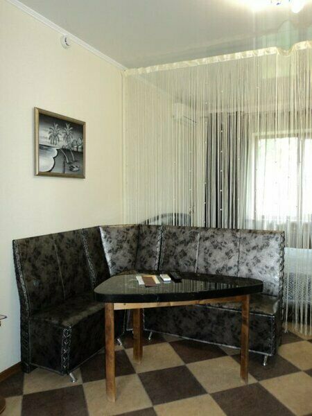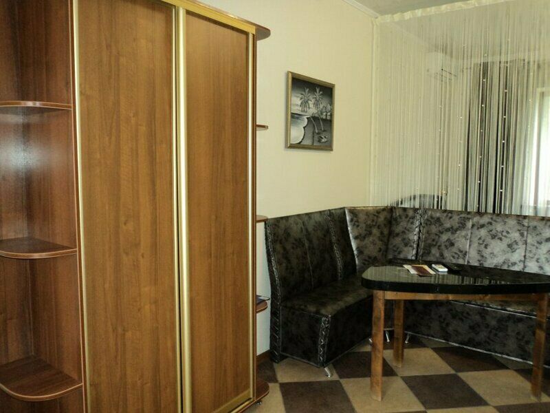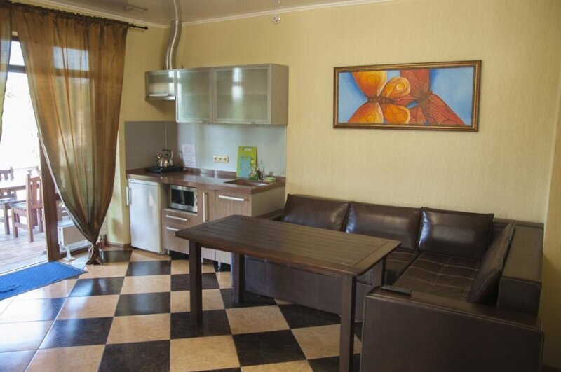 - мини — кухня: холодильник, электрочайник, кухонная мебель, столовая посуда и столовые приборы, угловой диван, столик;