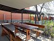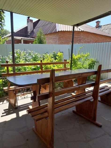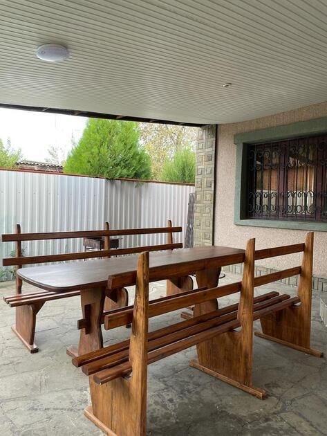 На территории дома — мангальная зона с большим столом и парковка на четыре машины.