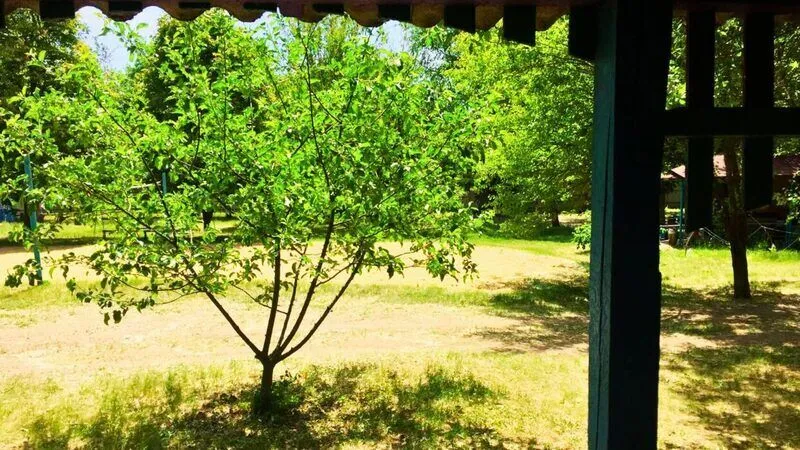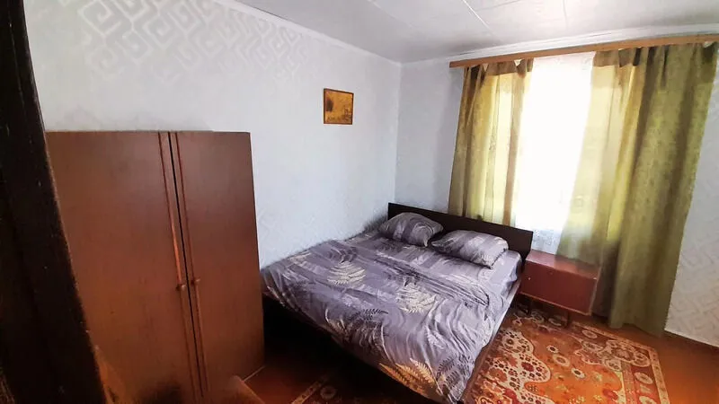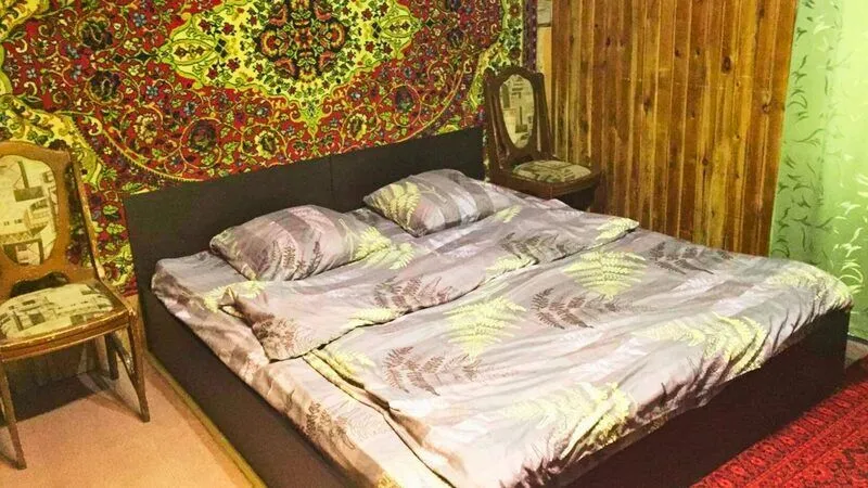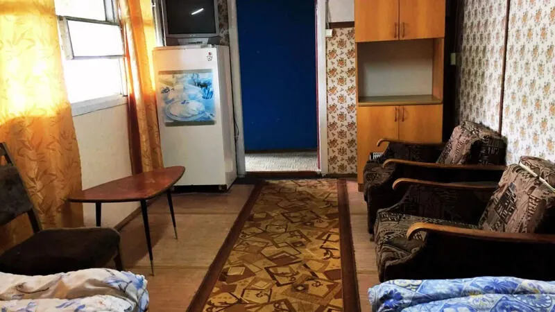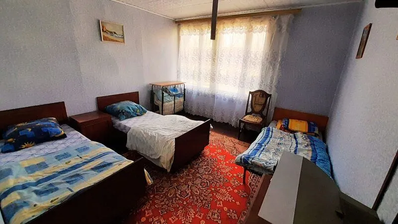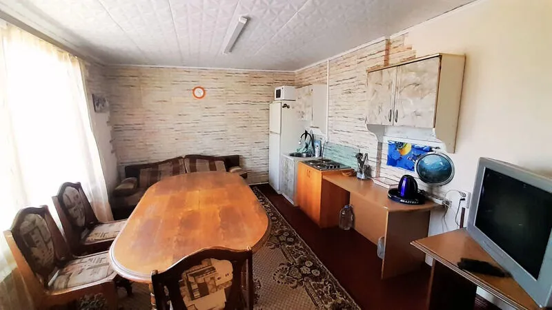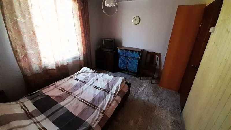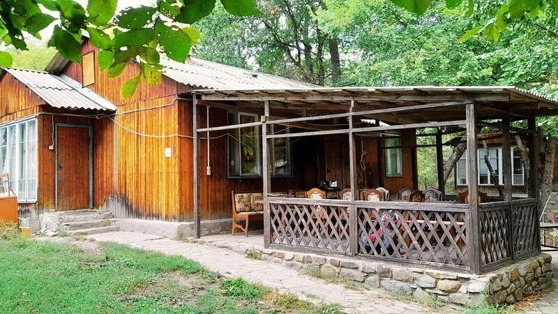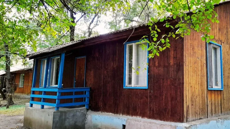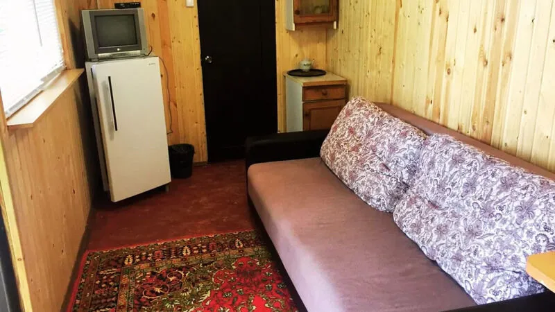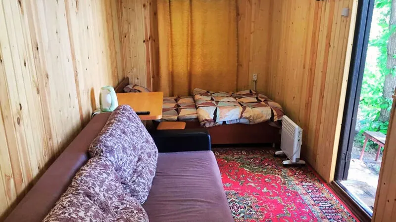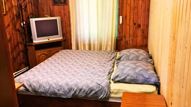 Деревянный домик с двумя номерами, по 3 спальных места в каждом номере. Душ (теплая вода), туалет, умывальники, летняя кухня находятся рядом с домиком.