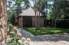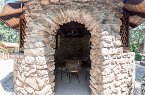Беседка с собственной мангальной зоной, мойкой и столом, находится в соснах.