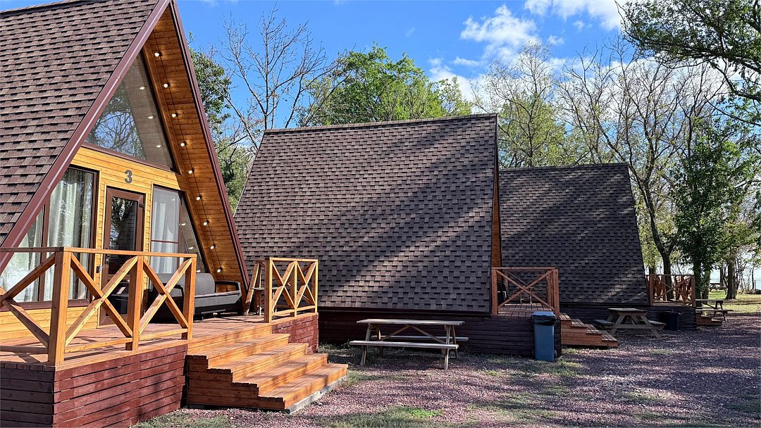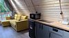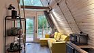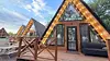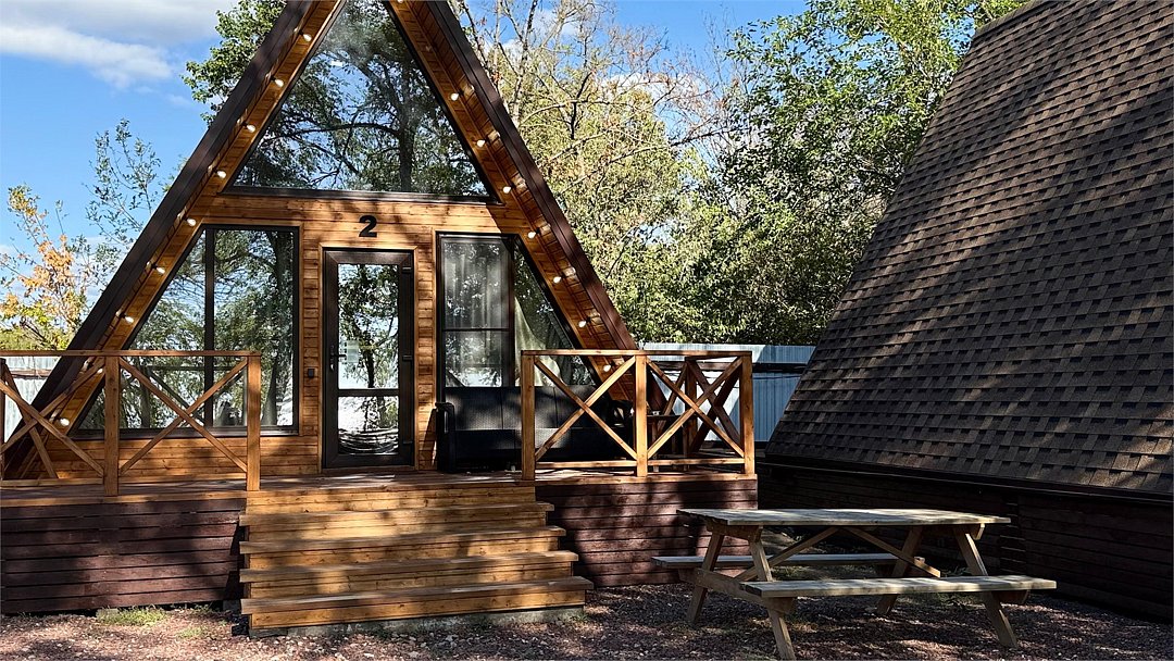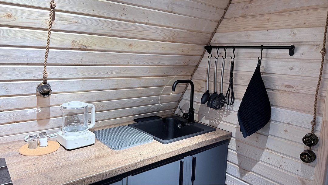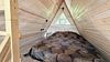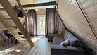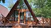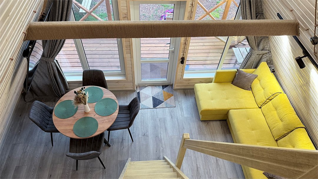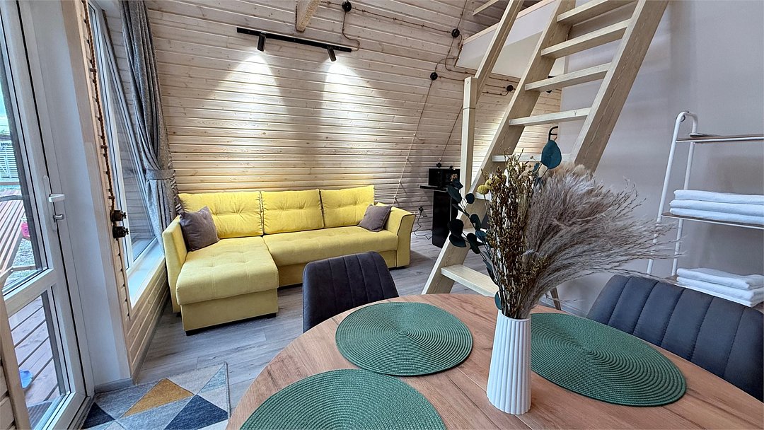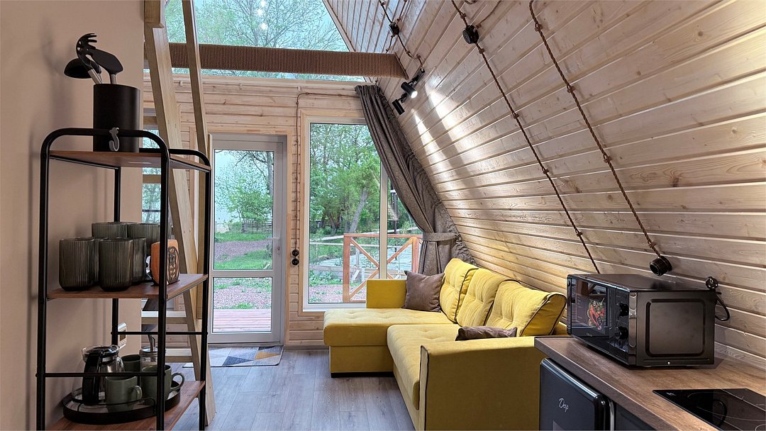 Двухместный двухуровневый дом A-frame повышенной комфортности позволит разместится двоим взрослым на основных местах и двоим детям– на дополнительном.